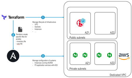 Working as a Solution Architect for F5, I often need to have access to a lab environment. 'Traditionally', the method to implement a lab was to leverage tools like Vagrant, VMWare, or others. A lab environment on a laptop is limited by its computing capacities (CPU/Memory/disk/...). Today we are often asked to show how we can integrate our solutions with many different tools (Orchestration solutions, Version Control systems, CI Servers, containerized environments, ...). Except if your laptop is a powerful one, it's difficult to build such an environment and have it run smoothly. If the lab requirements are too demanding for my laptop, I would access one of our lab facility to do my work. This approach itself is fine but bring some challenges: If you travel like I do, latency can become a hindrance and be frustrating. Lab facilities leverage "shared resources". Which means you may face issues due to conflicting IP addresses, switch misconfiguration, maintenance operations, ... Some resources may already be reserved/used by another fellow colleague and not be available. You may also face other constraints making both deployment models difficult: Need to share access to the lab. Not easy when it runs on your laptop or in a private cloud that is not always opened to the outside world. People may need to be able to replicate your lab in their own environment. Stability/time needed for maintenance: Using a lab over and over will make it messy. You usually At some point, you'll reach a stage where you want to create a "new" environment that is clean and "trustworthy" (until you played too much with it again) I'm sure i've missed other constraints but you get the idea: maintaining a lab and using it in a collaborative manner is challenging. Luckily, it's easier today to achieve those objectices: Leverage Public Cloud! Public Cloud gives you access to "unlimited" computing services over Internet that can be automated/orchestrated. With Public Cloud, you have access to an API allowing you to spin up a new environment with all the relevant tools deployed. This way, you may go straight into work (after enjoying a nice cup of coffee/tea while your infrastructure is being deployed! ). Once your work is done, you can destroy this environment and save money. When you'll need a lab again, you'll be able to spin a new/clean environment in a matter of minutes and be confident that it's a "healthy lab" When working on Automation/Orchestration of Public cloud environments, I see two dominant tools: Terraform and Ansible. https://www.terraform.io Terraform is an open source command line tool that can be used to provision an infrastructure on dozens of different platforms and services (AWS, Azure, ...). One of the strength of Terraform is that it is declarative: You specify the expected "state" of your infrastructure and Terraform will take care of all the underlying complexities (Does it need to be provisioned? Should I update the settings of a component? Which components should be created first? Do we need to delete resources that are not required anymore, ... ). Terraform will store the "state" of your infrastructure and configuration to be more efficient in its work. https://www.ansible.com Ansible is a provisioning and configuration management tool. It is designed to automate application deployments. One of the strength of Ansible is that it doesn't require any "agents" to run on the targetted systems. Ansible works by leveraging "Modules". Those modules are consumed to define the "state" of the targetted systems. They are usually executed over SSH (by default). So how to leverage those tools to have a lab available on-demand? In the following demo, we will: Leverage Terraform to manage the lifecycle of a new AWS environment: manage a dedicated VPC with external/internal subnets, Ubuntu instances, F5 solution) In addition to deploying our infrastructure, it will generate the relevant files for Ansible (inventory file to know the IPs of our systems, ansible variable files to know how to configure the F5 solution with AS3) Use Ansible to manage the configuration of our systems: update our ubuntu instances, install NGINX Web service on our Ubuntu instances, deploy a standard F5 configuration to load balance our web application with AS3 Here is a summary for the demo: Demo time! By leveraging tools like Terraform or Ansible (you can achieve the same results with other tools), it is easy to handle the lifecycle of an infrastructure and the services running on top of it. This is what people IaC (Infrastructure as Code) Useful links: - If you want to learn more about the setup of this demo, it is posted on Github: here- F5 provides a list of templates to automate deployment in public cloud. It's available here: AWS Templates, Azure Templates, GCP Templates- F5 Application Services 3 (AS3) documentation/examples: here- If you want to learn more about our API and how to automate/orchestrate F5 solutions (free training): F5 A&O Training1.2KViews2likes1CommentHow to Use BIG-IQ and Ansible to Build Advanced BIG-IP Automation Workflows