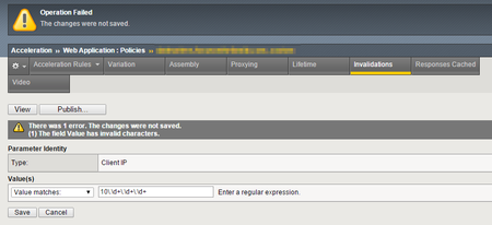 When I enter a regex in the "Client IP" field I get the message The field has invalid characters if the regex contains certain characters like \ and ^ . That seems a bit odd since those characters are rather fundamental parts of regex. Has anyone else encountered this?332Views0likes3CommentsHow to clear Web acceleration cache?