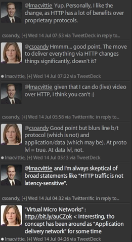 You can’t assume anything about an application’s performance and delivery needs based on the fact that it rides on HTTP. I read an interesting article during my daily perusal of most of the Internet (I’ve had to cut back because the Internet is growing faster than my ability to consume) on “Virtual Micro Networks.” The VMN concept goes well beyond Virtual Local Area Networks (VLANs). Like VLANs or any other network, VMNs transport data from source to destination. But VMNs extend beyond transport to consider security, location, users, and applications. VMNs address: Where is the information? The answer to this question used to be a physical server or storage device but application switching and server/storage virtualization makes this more dynamic and complex. […] VMNs also must be aware of traffic type. For example, voice, video, and storage traffic is extremely latency-sensitive while HTTP traffic is not. Additionally, some network traffic may contain confidential information that should be encrypted or even blocked. What are the specific characteristics of the information? Network-based applications may be made up of numerous services that come together at the user browser. How they get there isn’t always straightforward, thus the rise of vendors like Citrix NetScaler and F5 Networks. This is also where security comes into play as certain traffic may be especially sensitive, suspicious, or susceptible. [emphasis added] What’s driving creation of Virtual Micro Networks Okay, so first things first: the author really is using another term to describe what we’ve been calling for some time an application delivery network. That was cool in and of itself; not the emergence of yet another TLA but that the concept is apparently out there and rising. But what was even more interesting was the conversation this started on Twitter. If you don’t follow @csoandy (that’s the Twitternym of Andy Ellis of Akamai Networks) you might want to start. Andy pointed out that the statement “HTTP traffic is not latency-sensitive” is a bit too broad and went on to point out that it really depends on what you’re delivering. Live video, after all, is sensitive to latency no matter what protocol is transporting it. Andy put it well in an off-line conversation when he said, “There's also the myth that HTTP isn't for low latency apps. HTTP lets you take advantage of optimizations done in TCP and HTTP to accelerate delivery.” A great point and very true. All the “built-in acceleration and optimization” of an application delivery controller’s TCP stack is free for HTTP because after all, HTTP rides on TCP. But ironically this is also where things get a bit wonky. The reality is that the application data is sensitive, not the protocol. But because the data HTTP was initially designed to transport was not considered to be latency sensitive, you almost have to look at HTTP as though it is, which is why the broad statement bothered Andy in the first place. We wouldn’t say something like “TCP” or “UDP” is not sensitive to latency because these are transport layer protocols. We need to know about the data that’s being transported. Similarly, we can’t (anymore) say “HTTP isn’t sensitive to latency” because HTTP is the de facto transport protocol of web applications. As I remarked to Andy, the move to deliver everything via HTTP changes things significantly. “Things” being the entire realm of optimization, acceleration, and application delivery. Context is Everything As the initial blog post that started this conversation pointed out, and which nothing Andy and I discussed really changed, is that our nearly complete reliance on HTTP as the de facto transport protocol for everything means that the infrastructure really needs to be aware of the context in which requests and responses are handled. When an HTTP GET and its associated response might in one case be a simple binary image and in another case it might be the initiation of a live video stream, well, the infrastructure better be able to not only recognize the difference but handle them differently. HTTP doesn’t change regardless, but the delivery needs of the data do change. This is the “application aware” mantra we (as in the entire application delivery industry) have been chanting for years. And now it’s becoming an imperative because HTTP no longer implies text and images, it implies nothing. The infrastructure responsible for delivering (securing, optimizing, accelerating, load balancing) the access to that application data cannot assume anything; not session length, not content length, not content type, not optimal network conditions. The policies that might ensure a secure, fast, and available web application are almost certainly not the same policies that will provide the same assurance for video, or audio, or even lengthy binary data. The policies that govern the delivery of a user-focused application are not the same ones that should govern the delivery of integration-driven applications like Web 2.0 and cloud computing APIs. These are different data types, different use cases, different needs. Yet they are all delivered via the same protocol: HTTP. Dynamic Infrastructure Needed What makes this all even more complicated (yes, it does get worse as a matter of fact) is that not only is the same protocol used to deliver different types of data but in many cases it may be delivered to the same user in the same session. A user might move from an article or blog to a video back to text all the while a stream of Twitter and Facebook updates are updating a gadget in that application. And the same infrastructure has to handle all of it. Simultaneously. Wheeeeeeeeeee! That HTTP can be extended (and has been, and will continue to be) to include broad advanced capabilities has been a blessing and a curse, for as we deliver more and more differenter content over the same protocol the infrastructure must be 