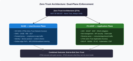 Introduction Zero Trust Architecture (ZTA) mandates “never trust, always verify”, explicit policy enforcement across every user, device, network, application, and data flow, regardless of location. The challenge is that ZTA isn’t a single product. It’s a model that requires enforcement at multiple planes. Two converged platforms cover those planes: SASE at the access edge, and F5 ADSP at the application edge. This article explains what each platform does, where the boundary sits, and why both are necessary. Two Planes, One Architecture SASE and F5 ADSP are both converged networking and security platforms. Both deploy across hardware, software, and SaaS. Both serve NetOps, SecOps, and PlatformOps through unified consoles. But they enforce ZTA at different layers, and at different scales. SASE secures the user/access plane: it governs who reaches the network and under what conditions, using ZTNA (Zero Trust Network Access), SWG, CASB, and DLP. F5 ADSP secures the application plane: it governs what authenticated sessions can actually do once traffic arrives, using WAAP, bot management, API security, and ZTAA (Zero Trust Application Access). The NIST SP 800-207 distinction is useful here: SASE houses the Policy Decision Point for network access; ADSP houses the Policy Enforcement Point at the application layer. Neither alone satisfies the full ZTA model. The Forward/Reverse Proxy Split The architectural difference comes down to proxy direction. SASE is a forward proxy. Employee traffic terminates at an SSE PoP, where identity and device posture are checked before content is retrieved on the user’s behalf. SD-WAN steers traffic intelligently across MPLS, broadband, 5G, or satellite based on real-time path quality. SSE enforces CASB, RBI, and DLP policies before delivery. F5 ADSP is a reverse proxy. Traffic destined for an application terminates at ADSP first, where L4–7 inspection, load balancing, and policy enforcement happen before the request reaches the backend. ADSP understands application protocols, session behavior, and traffic patterns, enabling health monitoring, TLS termination, connection multiplexing, and granular authorization across BIG-IP (hardware, virtual, cloud), NGINX, BIG-IP Next for Kubernetes (BNK), and BIG-IP CNE. The scale difference matters: ADSP handles consumer-facing traffic at orders of magnitude higher volume than SASE handles employee access. This is why full platform convergence only makes sense at the SMB scale, enterprise organizations operate them as distinct, specialized systems owned by different teams. ZTA Principles Mapped to Each Platform ZTA requires continuous policy evaluation, not just at initial authentication, but throughout every session. The table below maps NIST SP 800-207 principles to how each platform implements them. ZTA Principle SASE F5 ADSP Verify explicitly Identity + device posture evaluated per session at SSE PoP L7 authz per request: token validation, API key checks, behavioral scoring Least privilege ZTNA grants per-application, per-session access, no implicit lateral movement API gateway enforces method/endpoint/scope, no over-permissive routes Assume breach CASB + DLP monitors post-access behavior, continuous posture re-evaluation WAF + bot mitigation inspects every payload; micro-segmentation at service boundaries Continuous validation Real-time endpoint compliance; access revoked on posture drift ML behavioral baselines detect anomalous request patterns mid-session Use Case Breakdown Secure Remote Access SASE enforces ZTNA, validating identity, MFA, and endpoint compliance before granting access. F5 ADSP picks up from there, enforcing L7 authorization continuity: token inspection, API gateway policy, and traffic steering to protected backends. A compromised identity that passes ZTNA still faces ADSP’s per-request behavioral inspection. Web Application and API Protection (WAAP) SASE pre-filters known malicious IPs and provides initial TLS inspection, reducing volumetric noise. F5 ADSP delivers full-spectrum WAAP in-path, signature, ML, and behavioral WAF models simultaneously, where application context is fully visible. SASE cannot inspect REST API schemas, GraphQL mutation intent, or session-layer business logic. ADSP can. Bot Management SASE blocks bot C2 communications and applies rate limits at the network edge. F5 ADSP handles what gets through: JavaScript telemetry challenges, ML-based device fingerprinting, and human-behavior scoring that distinguishes legitimate automation (CI/CD, partner APIs) from credential stuffing and scraping, regardless of source IP reputation. AI Security SASE applies CASB and DLP policies to block sensitive data uploads to external AI services and discover shadow AI usage across the workforce. F5 ADSP protects custom AI inference endpoints: prompt injection filtering, per-model, rate limiting, request schema validation, and encrypted traffic inspection. The Handoff Gap, and How to Close It The most common zero trust failure in hybrid architectures isn’t within either platform. It’s the handoff between them. ZTNA grants access, but session context (identity claims, device posture score, risk level) doesn’t automatically propagate to the application plane. The fix is explicit context propagation: SASE injects headers carrying identity and posture signals; ADSP policy engines consume them for L7 authorization decisions. This closes the gap between “who is allowed to connect” and “what that specific session is permitted to do.” Conclusion SASE and F5 ADSP are not competing platforms. They are complementary enforcement planes. SASE answers: can this user reach the application? ADSP answers: What can this session do once it arrives? Organizations that deploy only one leave systematic gaps. Together, with explicit context propagation at the handoff, they deliver the end-to-end zero trust coverage that NIST SP 800-207 actually requires. Related Content Why SASE and ADSP are co
