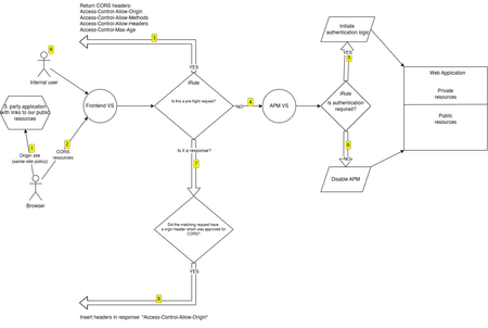 This is the story of a fight with CORS (Cross-Origin Resource Sharing) and the process of understanding how it actually works. APM is a powerful tool that provides solutions for both simple and complex use cases. However, I have historically struggled with one specific scenario: embedding an APM-protected application into a third-party site. Unfortunately APM doesn't provide any mechanism to make this easy. Everything works when accessing the APM application directly. But when the same application was embedded in another site, it failed silently—nothing rendered, and the browser console filled with errors. Since I never had the opportunity to fully investigate the issue, alternative solutions were usually chosen. Recently, I worked with a customer who needed protection for a web application, and APM seemed like the right fit. The application was divided into public and private components, where only the private resources required authentication. This appeared straightforward, and I initially assumed that some iRule logic would be sufficient. But unbeknownst to me the site was not always the entry point to the application which meant that I now had the same old problem with serving content to a 3. party site. Now I was forced to look into CORS for real and how to handle this beast. I used a fair amount of time to get a better understanding and to my surprise it wasn't really all that difficult to fix, it looked like I just needed to inject a couple of headers in the response and then it would all be dandy. This is where the complexity began - specifically around iRules on a virtual server with APM enabled; I just couldn't get it to insert the headers the way I wanted. While there are multiple ways to solve this, I chose a layered virtual server design to keep the logic clean and predictable. This weird construct has been my goto solution for some time now and proven quite reliable. With a layered VS you have two virtual servers which are glued together via an iRule command "virtual". This gives you the option to run modules, iRules, policies etc. independently of each other. One of the VS' is the entry point and based on the logic you then forward traffic to the second one. In this setup the frontend virtual server - the one exposed to the users - has a single iRule responsible for: Handling CORS preflight requests by returning the appropriate headers Injecting CORS headers into responses when the origin is allowed Forwarding all non-preflight requests to the APM virtual server This separation ensures full control over HTTP processing without being constrained by APM behavior. On the inner APM virtual server, an access profile is attached which handles authentication. I usually set a non-reachable IP address on the inner VS to ensure that it can only be reached via the frontend VS. Initially, I planned to use a per-request policy on the inner APM VS with a URL branch agent to determine whether a request should be authenticated or not. While this looked correct on paper, it failed in practice. The third-party site was requesting embedded resources (such as images), and its logic could not handle APM redirects (e.g., '/my.policy'). One possible workaround was to use "clientless mode" by inserting the special header: HTTP::header insert "clientless-mode" 1 However, this introduces additional logic without providing real benefits and I wasn't sure if the application would handle the session cookie correctly or just create a million new APM sessions. Instead, I implemented an iRule that performs a datagroup lookup. If a match is found, APM is bypassed entirely for that request. This approach is simpler to maintain and reduces load by not utilizing the APM module. Below is a diagram illustrating the request flow and decision logic: A user browses the 3. party site which has links to our site. The Origin site. The browser retrieves the resources on our site. Should the browser decided to make a preflight request, the iRule will verify the Origin header from a datagroup and if allowed return the CORS headers. Forward the traffic to the inner APM VS. The iRule on the inner APM VS looks up in a datagroup and find no match and the authentication process is executed. The iRule on the inner APM VS looks up in a datagroup and find a match and disables APM. On the response from the backend we check if the origin was on the approved list. and if so we inject the CORS headers which will allow for the browser to show the content. A user browses the site directly which will bypass any CORS logic. Here is the iRule for the frontend VS: # ============================================================================= # iRule: Outer virtual for redirect + CORS before APM # ----------------------------------------------------------------------------- # Purpose: # - Redirect "/" on portal.example.com to /portal/home/ # - Handle CORS preflight locally before APM # - Forward all other traffic to the inner APM virtual # - Inject CORS headers into normal responses # # Dependencies: # - Attached to outer/public virtual server # - Inner virtual server exists and is called via "virtual" # - Internal string datagroup for allowed CORS origin hostnames # # Datagroups: # - portal_example_com_allowed_cors_origins_dg # # Notes: # - Datagroup must contain lowercase hostnames only # - Empty datagroup = allow all origins # # ============================================================================= when RULE_INIT { set static::portal_example_com_outer_cors_debug_enabled 1 } when HTTP_REQUEST { # Initialize request-scoped state explicitly. set cors_origin "" set cors_origin_host "" set cors_is_allowed 0 if { $static::portal_example_com_outer_cors_debug_enabled } { log local0. "debug: HTTP_REQUEST start - host=[HTTP::host] uri=[HTTP::uri] method=[HTTP::method]" } # ------------------------------------------------------------------------- # Root redirect # ------------------------------------------------------------------------