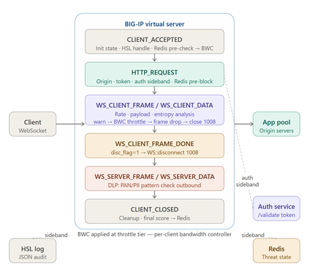 Problem WebSocket traffic introduces a fundamentally different security model from traditional HTTP. After the initial upgrade request, communication becomes long-lived, bidirectional, and frame-based, with no ongoing request/response structure for conventional controls to inspect. Existing WebSocket protections already provide important controls such as payload signature inspection, frame and message size limits, protocol compliance, origin enforcement, and structured content validation. These protections are valuable during the upgrade phase and for known attacks within frame content. The remaining challenge is per‑client behavioral analysis across live frame streams. Once a session is established, the protocol itself offers no native mechanism to evaluate how a specific client behaves over time: How fast frames are being sent Whether payloads are repetitive and automation-like Whether oversized frames are being used for resource exhaustion Whether abusive users reconnect across clustered devices Whether cumulative risk should trigger proportional enforcement Common session-layer abuse patterns include: High-rate message floods from a single client Low-and-slow bots staying below rate thresholds Oversized frames intended to exhaust backend resources Reconnect evasion across clustered load balancers Lack of adaptive per-client scoring during live sessions This is where iRules are uniquely positioned. Running directly in the F5 TMM fast path, iRules can inspect every WebSocket frame in real time, maintain per-client state across the session lifetime, and enforce graduated responses, without application changes, external agents, or protocol redesign. WS-Shield extends policy enforcement from the upgrade handshake into the active WebSocket session itself. Solution WS-Shield is a five-layer behavioral enforcement engine implemented entirely in iRules. It continuously evaluates client behavior across WebSocket frames and calculates a cumulative abuse score using multiple independent signals, then applies proportional responses based on threat level. Layer 1 — Upgrade Gate (HTTP_REQUEST) Five checks run before the 101 Switching Protocols response is sent: Source IP checked against ws_blocked_ips Origin validated against ws_allowed_origins Authentication token required: Sec-WebSocket-Protocol: Bearer.<jwt> or ?token= query parameter Token validated through sideband HTTP call (200 / 401) configurable fail-open if auth service unavailable Redis cluster pre-check: previously abusive clients can be blocked before handshake completion Layer 2 — Rate Analysis (WS_CLIENT_DATA) Per-client message volume is tracked in a sliding time window using session table state. Projected frame rate contributes to the abuse score. Detects: Floods Bursts Reconnect storms Sustained automation traffic Layer 3 — Payload Size Analysis Frame size is scored independently of rate. A single oversized frame can raise risk even if sent slowly. This detects low-frequency resource exhaustion attempts. Layer 4 — Entropy / Repetition Analysis A lightweight unique-byte approximation evaluates the first 512 bytes of each payload. Low-entropy traffic such as repetitive templates or bot-generated filler contributes to the abuse score. This detects slow bots that intentionally remain below rate thresholds. Tested Result: a client sending repetitive 300-byte payloads every 0.5 seconds was disconnected at score 100 while still below all configured rate thresholds. Layer 5 — Cumulative Score with Decay Signals from rate, payload size, and entropy feed a weighted abuse score. Clean frames reduce score gradually, allowing legitimate bursts to recover naturally while sustained abuse escalates. Adaptive Behavioral Scoring: The "Leaky Bucket" Model WS-Shield moves away from "binary" blocking (Allow vs. Deny) and adopts a fluid reputation system. We treat the cumulative abuse score like a Leaky Bucket. 1. The Scoring Dynamics The Inflow (Risk Accumulation): Every frame is a potential "drop" of risk. If a client sends a 100KB frame, we add +50 to the bucket. If they send a low-entropy (repetitive) bot payload, we add +25. The Leak (Automatic Decay): Every time the client behaves—sending a "clean" frame that passes all checks—the score decays by 1. The Outcome: This distinguishes between a malicious actor (who fills the bucket faster than it can leak) and a power user (who might have a temporary burst that decays back to a "Green Zone" naturally). 2. Graduated Enforcement Tiers The iRule maps the "water level" of the bucket to four distinct enforcement actions, ensuring we only use the "heavy hammer" when absolutely necessary. Score Level Enforcement State Action Business Logic 0 - 29 TRUSTED None Normal operational flow. 30 - 59 SUSPICIOUS Warn | HSL::send Log metadata to SIEM for behavioral profiling. 60 - 79 RESTRICTED Throttle | BWC::policy attach Adaptive Throttling. We preserve the session but limit bandwidth to protect the backend. 80 - 99 SUPPRESSED Drop | WS::frame drop Silent Discard. The client thinks they are sending data, but it never reaches the server. 100+ TERMINATED Disconnect | WS::disconnect Hard Block. RFC 6455 1008 close code issued and IP blacklisted in Redis. Cluster-Wide Threat Sharing Threat state is stored in Redis using automatic expiry. On new connections, prior threat state can be consulted before application data is exchanged. Benefits: Reconnect deterrence Cross-node reputation sharing Immediate pre-enforcement Consistent cluster behavior A client disconnected on one device cannot simply reconnect elsewhere and start clean. Outbound DLP Controls Server-to-client text frames can also be inspected. Example controls: Payment card (PAN) detection Sensitive data suppression Policy-based frame dropping Binary and control frames pass normally. Architecture Overview Impact Better Protection for Real-Time Apps Designed for: AI streaming interfaces Financial trading feeds Chat / collaboration systems Gaming b