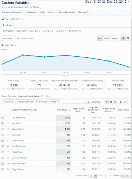 May your Christmas be merry, bright, and full of the joy of the season! As for me and mine, we're outta here this week. Posts will resume next week, but they'll be unattended as our family will be enjoying the warm seas of the Caribbean until well after the holiday season. Thanks for an awesome year of conversation and I look forward to even more next year. Until then, I wish you all the best. Lori139Views0likes0CommentsTracking Author Statistics for Bloggers