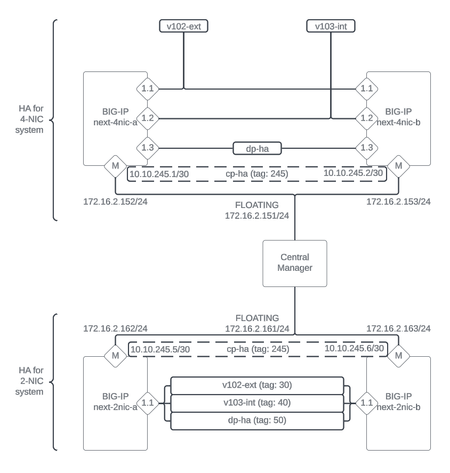 With BIG-IP classic, there are a lot of design choices to make and steps on both systems to arrive at an HA pair. With BIG-IP Next, this is simplified quite a bit. Once configured, the highly available pair is treated by Central Manager as a single entity. There might be alternative options in the future, but as of version 20.1, HA for instances is active/standby only. In this article, I'll walk you through the steps to configure HA for instances in the Central Manager GUI. Background and Prep Work I set up two HA systems in my preparation for this article. The first had dedicated interfaces for the management interface, the external and internal traffic interfaces, and the HA interface. So when configuring the virtual machine, I made sure each system had four NICs. For the second, I merged all the non-management interfaces on a single NIC and used vlan tagging, so those systems had two NICs. In my lab that looks like this: The IP addressing scheme in my lab is shown below. First the four NIC system: 4-NIC System next-4nic-a next-4nic-b floating mgmt 172.16.2.152/24 172.16.2.153/24 172.16.2.151/24 cntrlplane ha (vlan 245) 10.10.245.1/30 10.10.245.2/30 NA dataplane ha (int 1.3) 10.0.5.1/30 10.0.5.2/30 NA dataplane ext (int 1.1) 10.0.2.152/24 10.0.2.153/24 10.0.2.151/24 dataplane int (int 1.2) 10.0.3.152/24 10.0.3.153/24 10.0.3.151/24 And now the two NIC system: 2-NIC System next-2nic-a next-2nic-b floating mgmt 172.16.2.162/24 172.16.2.163/24 172.16.2.161/24 cntrlplane ha (vlan 245) 10.10.245.5/30 10.10.245.6/30 NA dataplane ha (vlan 50) 10.0.5.5/30 10.0.5.6/30 NA dataplane ext (vlan 30) 10.0.2.162/24 10.0.2.163/24 10.0.2.161/24 dataplane int (vlan 40) 10.0.3.162/24 10.0.2.163/24 10.0.3.161/24 Beyond the self IP addresses for your traffic interfaces, you'll need additional IP addresses for the floating address, the control-plane HA sub-interfaces (which are created for you), and teh data-plane HA interfaces. Before proceeding, make sure you have a plan for network segmentation and addressing similar to above, you've installed two like instances, and that one (and only one) of them is licensed. Configuration This walk through is for the 2-NIC system shown above, but the steps are mostly the same. First, login to Central Manager, and click on Manage Instances. Click on the standalone mode for the system you want to be active initially in your HA pair. For me, that's next-2nic-a. (You can also just click on the system name and then select HA in the menu, but this saves a click.) In the pop-up dialog, select Enable HA. Read the notes below to make sure your systems are ready to be paired. On this screen, a list of available standalone systems will populate. Click the down arrow and select your second system, next-2nic-b in my case. Then click Next. On this next prompt, you'll need to create two vlans, one for the control plane and one for the data plane. The control plane mechanics are taken care of for you and you don't need to plan connectivity other than to select an available vlan that won't conflict with anything else in your system. For the data plane, you need to have a dedicated vlan and/or interface set aside. Click Create VLAN for the control plane. Name and tag your vlan. In my case I used cp-ha as my vlan name and tag 245. Click Done. Now click Create VLAN for the data plane. Because I'm tagging all networks on the 2-NIC system, my own interface is 1.1. So I named my data plan vlan dp-ha, set the tag to 50, selected interface 1.1, and clicked Done. Now that both HA VLANs have been created, click Next. On this screen, you'll name your HA pair system. This will need to be unique from other HA pairs, so plan accordingly. I named mine next-ha-1, but that's generic and unlikely to be helpful in your environment. Then set your HA management IP, this is how Central Manager will connect to the HA pair. You can enable auto-failback if desired, but I left that unchecked. For the HA Nodes Addresses, I referenced my addressing table posted at the top of this article and filled those in as appropriate. When you get those filled out, click Next. Now you'll be presented with a list of your traffic VLANs. On my system I have v102-ext and v103-int for my external and internal networks. First, I clicked v102-ext. On this screen you'll need to add a couple rows so you can populate the active node IP, the standby node IP, and the floating IP. The order doesn't matter, but I ordered them as shown, and again referenced my addressing table. Once populated, click Save. That will return you to this screen, where you'll notice that v102-ext now has a green checkbox where the yellow warning was. Now click into your other traffic VLAN (v103-int in my case) if applicable to your environment or skip this next step. This is a repeat of the external traffic network for the internal traffic network. I referenced my address table one more time and filled the details out as appropriate, then clicked Save. Make sure that you have green checkboxes on the traffic VLANs, then click Next. Review the summary of the HA settings you've configured, and if everything looks right, click Deploy to HA. On the "are you sure?" dialog where you're prompted to confirm your deployment, click Yes, Deploy. You'll then see messaging at the top of the HA configuration page for the instance indicating that HA is being created. Also note that the Mode on this page during creation still indicates standalone. Once the deployment is complete, you'll see the mode has changed to HA and the details for your active and standby nodes are provided. Also present here is the Enable automatic failover option, which is enabled by default. This is for software upgrades. If left enabled, the standby unit will be upgraded first, a failover will be executed, and the the remaining system will be upgraded. If in your HA configuration you specified auto-failback, then after the second system is upgraded there will be another failover executed to complete the