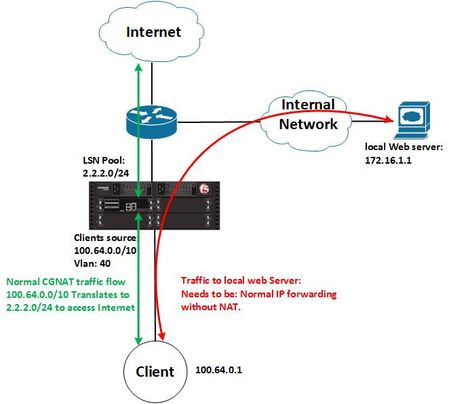 I have scenario according to the diagram using VIPRIOM 2400 platform as CGNAT solution. I'm using CGNAT for translating our clients(SRC: 100.64.0.0/10) for Internet access. In our regular scenario F5 box translate client address for both Internet access and our internal servers. Now we have a situation where we need our clients connected to an internal web-server(172.16.1.1) with their actual IP address(100.64.0.0/10)). for this purpose I created two 'IP forwarding' matching web-server IP address in each direction. the point is I've Created CGNAT virtual server for Internet access and LTM Virtual server for matching traffic to/from local web server. Clients Internet access which works without any problem. but It seems web-server virtual server doesn't match with any traffic. ltm virtual CGNAT-BRAS--ACCESS-01 { description CGNAT-BRAS--ACCESS-01 destination 0.0.0.0%101:any mask any profiles { CGNAT-L4 { } } source 100.64.0.0%101/10 source-address-translation { pool CGNAT-ACCESS-01 type lsn } translate-address disabled translate-port disabled vlans { VLAN-40 } vlans-enabled vs-index 26 } ltm profile fastl4 CGNAT-L4 { app-service none defaults-from fastL4 loose-close enabled loose-initialization enabled reassemble-fragments enabled reset-on-timeout disabled } ltm virtual local-web-forwarding-client-side { destination 172.16.1.1%101:any l2-forward mask 255.255.255.255 profiles { Forwarding_VS { } } source 100.64.0.0%101/10 translate-address enabled translate-port disabled vlans { VLAN-40 } vlans-enabled vs-index 46 } ltm virtual local-web-forwarding-network-side { destination 100.64.0.0%101:any ip-forward mask 255.192.0.0 profiles { Forwarding_VS { } } source 172.16.1.1%101/32 translate-address disabled translate-port disabled vlans { VLAN-41 } vlans-enabled vs-index 47 } ltm profile fastl4 Forwarding_VS { app-service none defaults-from fastL4 idle-timeout 300 loose-initialization enabled reset-on-timeout disabled }520Views0likes0Comments