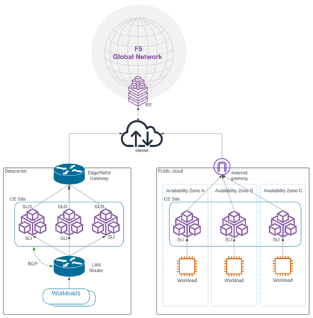 Purpose This guide describes the reference architecture for deploying F5 Distributed Cloud’s (XC) Multicloud Network Connect service to interconnect their workload across private connectivity or the internet. It enumerates the options available to an F5 Distributed Cloud user to configure site-to-site connectivity using F5 XC Customer Edges (CEs) and explains them in detail to help the user make informed decisions to choose the correct topology for their use case. Audience This guide is for technical readers, including network admins and architects who want to understand how the Multicloud Network Connect service works and what network topology they must use to interconnect their workloads across data centers, branches, and public clouds. This guide assumes the reader is familiar with networking concepts like routing, default gateway configurations, IPSec and SSL encryption, and private connectivity solutions provided by public clouds like AWS Direct Connect and Azure Express Route. Introduction Ensuring workload reachability across data centers, branches, and/or public cloud can be challenging and operationally complex if done in the traditional way. The network teams must design, configure, and maintain multiple networking and security equipment and need expertise across many vendor solutions that provide functionality like NAT, SD-WAN, VPN, firewalls, access control lists (ACLs), etc. This gets even more nuanced while connecting two networks that have overlapping IP address CIDRs which is often in the case of hybrid cloud deployments and during mergers and acquisitions. F5 XC Multicloud Network Connect provides a simple way to configure these interconnections and manage access and security policies across multiple heterogeneous environments, from a single console. It abstracts the complexities by taking the user intent and automating the underlying networking and security while providing the flexibility to choose to connect over a private network or the public internet. Customer Edge as a Gateway To provide site-to-site reachability and ensure enforcement of the security policies, traffic must flow through the CE site. For this, the CE’s Site Local Inside (SLI) IP address must be used as the default gateway or as the next hop to reach the networks on other sites. Figure: Using CE as the gateway Physical vs. Logical Connectivity Two or more CE sites can be physically connected in multiple ways. But this does not automatically allow networks on different sites to be L3 routable to each other by default. For this, the user must associate networks with segments. The physical connection dictates the path the packets will take while going from one site to the other, and the logical connection connects the VLANs (on-prem) and the VPCs/VNETs (in the public cloud) using network overlay and provides segmentation. Note: Multicloud Network Connect provides Layer 3 connectivity between networks. Configuring L3 connectivity is not required to have app-to-app connectivity across the sites. This is done using the distributed load balancer feature under App Connect. Physical Transit Options Over F5 Global Network Backbone A CE site is always connected to the two nearest Regional Edges (REs) for redundancy, using IPSec or SSL tunnels. The REs across different regions are connected via a global, private F5 backbone network. F5’s global network backbone provides high-speed, private transit across regions where Regional Edges are located. Users can use the CE-RE tunnels over the internet to securely connect to this backbone locally and leverage the private connectivity to connect across regions. Figure: Default CE-CE connectivity over REs and F5 network backbone Pros: No need to manage underlay networking if using CE-RE tunnels over the internet. High-speed private transit between geographically distant regions, at no extra cost. End-to-end encryption of traffic between sites. Option to have end-to-end private connectivity Cons: Throughput is limited to the bandwidth of the two tunnels per site. When To Use: The easiest way to connect when private connectivity is not available between data centers or to the cloud VPCs in the case of hybrid cloud. IPSec/SSL tunnels over the internet are acceptable, but you do not want to manage multiple VPN tunnels or SD-WAN devices. Connecting geographically distant sites and you need better end-to-end latency and reliability than going over the internet. Direct Site-to-Site Over Internet If security regulations prevent the use of F5’s private backbone network, users can connect the CE sites directly to each other using IPSec tunnels (SSL encryption is not supported in this case). This is done using the Site Mesh Group (SMG) feature. Note: Even when the CEs are a part of Site Mesh Group, they will still connect to the REs using encrypted tunnels as this is required for control plane connectivity. When the sites are in an SMG, the data path traffic flows through the CE-CE tunnels as the preferred path. If this link fails, as a backup, the traffic gets routed to the REs and over the F5 network backbone to the other site. The number of tunnels on each link between two CE sites depends on the number of control nodes they have. Two single-node sites are connected using only one tunnel. If any one of these sites has three control nodes, it forms three tunnels to the other site. Figure: Number of tunnels between sites in a SMG Pros: Sites are directly connected, so the data path is not dependent on RE. Easy connectivity over the internet Traffic is always encrypted in transit Eliminates the need to manually configure cross-site VPNs or SD-WAN. Cons: Encryption and decryption require more CPU resources on CE nodes as performance requirements increase. Note: L3 Mode Enhanced Performance can be enabled on the sites to get more performance from available CPU and memory resources, but this must be enabled when the site is used only for L3 connectivity as it reduces the resour