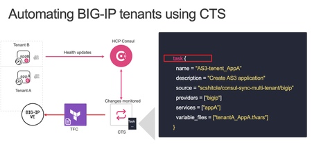 Deploying application workloads by developers or scaling operations traditionally involves submitting tickets, the network team assigning IP addresses, and the security team configuring policies. This siloed approach is time and resource intensive. Today, there are tools and automation to simplify processes and help developers become more independent to deploy and scale applications securely. In today's blog, we will talk about how we can deploy secure applications with an Advanced Web Application Firewall (AWAF) Policy on a F5 BIG-IP using automation. We will also look at a scenario where an existing application can be scaled up or scaled down, without any manual interventions. First, let us look at the tools involved. What are the Tools used? We will be using F5 Application Services Templates (FAST) to deploy application objects and AWAF policy on the BIG-IP. For more details about FAST, refer to https://clouddocs.f5.com/products/extensions/f5-appsvcs-extension/latest/ We will also be using HashiCorp Consul Terraform Sync, Consul HCP, and Terraform Cloud to automate our application management workflows. How does the solution work? We will use Consul Terraform Sync (CTS) to define the tasks. The tasks in CTS refer to the BIG-IP-Terraform module that has the FAST terraform resource. This is used to push the necessary configurations object whenever services are added or removed on a BIG-IP. The back end application nodes are running the consul agent and are registered to HCP Consul. CTS continuously monitors the HCP Consul catalog for changes. Let's talk about the CTS file, below is an example CTS file which you can customize and use it. # Consul Block consul { address = "localhost:8500" service_registration { enabled = true service_name = "CTS Event AS3 WAF" default_check { enabled = true address = "http://localhost:8558" } } token = "${consul_acl_token}" } # Driver block driver "terraform-cloud" { hostname = "https://app.terraform.io" organization = "SCStest" token = "<token>" required_providers { bigip = { source = "F5Networks/bigip" } } } terraform_provider "bigip" { address = "5.2.2.29:8443" username = "admin" password = "s8!" } task { name = "AS3-tenent_AppA" description = "BIG-IP example" source = "scshitole/consul-sync-multi-tenant/bigip" providers = ["bigip"] services = ["appA"] variable_files = ["tenantA_AppA.tfvars"] } task { name = "AS3-tenent_AppB" description = "BIG-IP example" source = "scshitole/consul-sync-multi-tenant/bigip" providers = ["bigip"] services = ["appB"] variable_files = ["tenantB_AppB.tfvars"] } Consul Block contains Consul agent address with the port, health check and HCP Consul token information. Driver block consists of terraform cloud details like org name, HCP terraform token and BIG-IP provider. You can also pass the address, username & password for BIG-IP provider using env variables. You can see we have a ‘task’ block in the configuration, this block defines what will be configured on the BIG-IP whenever a service is registered to the HCP Consul Catalog. In the above example, we have service or app ‘AppA’ so whenever CTS sees that service on the HCP Consul catalog it will push the configuration on BIG-IP using the terraform module provided in the source in the task block. The source in the task block uses terraform module registered at https://registry.terraform.io/modules/scshitole/consul-sync-multi-tenant/bigip/latest and the repository is at https://registry.terraform.io/modules/scshitole/consul-sync-multi-tenant/bigip/latest The terraform module uploads the FAST template file into the BIG-IP along with the virtual server and pool configuration. It also attaches the AWAF policy to the virtual server. Enables BIG-IP to do service discovery for Service Events on HCP Consul Creates a new example API endpoint like /mgmt/shared/service-discovery/task/~Consul_SD~Nginx~nginx_pool Which can be used to configure the pool member using the terraform resource "bigip_event_service_discovery” to add or remove the pool members Below is the example Fast template YAML title: Consul Service Discovery description: This template will create a virtual server that will use event driven service discovery definitions: tenant: title: Name of tenant description: give a unique name for this tenant app: title: Application description: give a unique name for this application defpool: title: pool defination description: should follow format poolname_pool only virtualAddress: title: Virtual Address description: IP addresses of virtual addresses (will create 80/443) virtualPort: title: Virtual Port description: Port that will be used type: integer parameters: virtualAddress: 10.0.0.200 virtualPort: 8080 tenant: "Consul_SD" app: "Nginx" defpool: "nginx_pool" template: | { "class": "AS3", "action": "deploy", "persist": true, "declaration": { "class": "ADC", "schemaVersion": "3.0.0", "id": "urn:uuid:940bdb69-9bcd-4c5c-9a34-62777210b581", "label": "Consul Webinar", "remark": "Consul Webinar", "{{tenant}}": { "class": "Tenant", "{{app}}": { "class": "Application", "{{app}}_vs": { "class": "Service_HTTP", "virtualPort": {{virtualPort}}, "virtualAddresses": [ "{{virtualAddress}}" ], "pool": "{{defpool}}", "policyWAF": { "use": "Arcadia_WAF_API_policy" }, "persistenceMethods": [], "profileMultiplex": { "bigip": "/Common/oneconnect" } }, "Arcadia_WAF_API_policy": { "class": "WAF_Policy", "url": "https://gist.githubusercontent.com/scshitole/7b7cdcfbd48797d90769ae587324cc9b/raw/6f7a9be072230685956f84652312b3c7e153c6cf/WAFpolicy.json", "ignoreChanges": true }, "{{defpool}}": { "class": "Pool", "monitors": [ "http" ], "members": [{ "servicePort": 80, "addressDiscovery": "event" }] } } } } } and here is the module main.tf file terraform { required_providers { bigip = { source = "f5networks/bigip" version = "~> 1.15.0" } } } locals { tenant_params = jsonencode({ "tenant": var.tenant, "app": var.app, "virtualAddress": var.virtualAddress, "defpool": var.defpool, "virtualPort": var.virt
