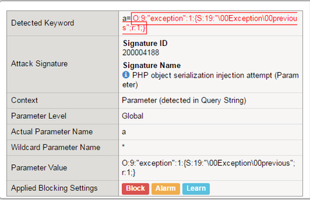 Recently researchers at "Check Point" have uncovered 3 new previously unknown vulnerabilities in the new version of PHP. CVE-2016-7479 and CVE-2016-7480 could result in attackers taking a full control of the target server, while CVE-2016-7478 causes a Denial of Service condition resulting in server hang. Those vulnerabilities are related to triggering unwanted behaviour when PHP un-serializes objects. Such malicious objects might be sent to any PHP application as HTTP parameter, cookie or header values. Mitigation with Big-IP ASM BigIP-ASM customers are already protected against the new 0-days, while the attack will be detected and blocked by existing "Server Side Code Injection" signatures, specifically: "PHP object serialization injection attempt (Parameter)" (200004188) "PHP object serialization injection attempt (Header)" (200004189) "PHP object serialization injection attempt (URI)" (200004190) Following are examples of the blocked attack vectors related to those CVEs and the invoked attack signatures: Figure 1: Denial of Service attack vector (CVE-2016-7478) blocked with Attack Signature (200004188) Figure 2: CVE-2016-7479 proof of concept exploit Figure 3: CVE-2016-7479 POC exploit is being blocked with Attack Signature (200004188) Figure 4: CVE-2016-7479 "DateInterval" attack vector blocked with Attack Signature (200004188)596Views0likes0Comments