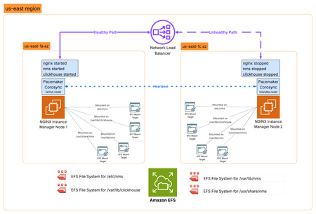 Introduction F5 NGINX Instance Manager gives you a centralized way to manage NGINX Open Source and NGINX Plus instances across your environment. It’s ideal for disconnected or air-gapped deployments, with no need for internet access or external cloud services. The NGINX Instance Manager features keep changing. They now include many features for managing configurations, like NGINX config versioning and templating, F5 WAF for NGINX policy and signature management, monitoring of NGINX metrics and security events, and a rich API to help external automation. As the role of NGINX Instance Manager becomes increasingly important in the management of disconnected NGINX fleets, the need for high availability increases. This article explores how we can use Linux clustering to provide high availability for NGINX Instance Manager across two availability zones in AWS. Core Technologies Core technologies used in this HA architecture design include: Amazon Elastic Compute instances (EC2) - virtual machines rented inside AWS that can be used to host applications, like NGINX Instance Manager. Pacemaker - an open-source high availability resource manager software used in Linux clusters since 2004. Pacemaker is generally deployed with the Corosync Cluster Engine, which provides the cluster node communication, membership tracking and cluster quorum. Amazon Elastic File System (EFS) - a serverless, fully managed, elastic Network File System (NFS) that allows servers to share file data simultaneously between systems. Amazon Network Load Balancer (NLB) - a layer 4 TCP/UDP load balancer that forwards traffic to targets like EC2 instances, containers or IP addresses. NLB can send periodic health checks to registered targets to ensure that traffic is only forwarded to healthy targets. Architecture Overview In this highly available architecture, we will install NGINX Instance Manager (NIM) on two EC2 instances in different AWS Availability Zones (AZ). Four EFS file systems will be created to share key stateful information between the two NIM instances, and Pacemaker/Corosync will be used to orchestrate the cluster - only one NIM instance is active at any time and Pacemaker will facilitate this by starting/stopping the NIM systemd services. Finally, an Amazon NLB will be used to provide network failover between the two NIM instances, using an HTTP health check to determine the active cluster node. Deployment Steps 1. Create AWS EFS file systems First, we are going to create four EFS volumes to hold important NIM configuration and state information that will be shared between nodes. These file systems will be mounted onto: /etc/nms, /var/lib/clickhouse, /var/lib/nms and /usr/share/nms inside the NIM node. Take note of the File System IDs of the newly created file systems. Edit the properties of each EFS file system and create a mount target in each AZ you intend to deploy a NIM node in, then restrict network access to only the NIM nodes by setting up an AWS Security Group. You may also consider more advanced authentication methods, but these aren't covered in this article. 2. Deploy two EC2 instances for NGINX Instance Manager Deploy two EC2 instances with suitable specifications to support the number of data plane instances that you plan to manage (you can find the sizing specifications here) and connect one to each of the AZ/subnet that you configured EFS mount targets in above. In this example, I will deploy two t2.medium instances running Ubuntu 24.04, connect one to us-east-1a and the other to us-east-1c, and create a security group allowing only traffic from its local assigned subnet. 3. Mount the EFS file systems on NGINX Instance Manager Node 1 Now we have the EC2 instances deployed, we can log on to Node 1 and mount the EFS volumes onto this node by executing the following steps: 1. SSH onto Node 1 2. Install efs-utils package if is not installed already 3. Edit /etc/fstab and create an entry for each EFS File System ID and its associated mount directory 4. Execute mount -a to mount the file systems 5. Execute df to ensure that the paths are mounted correctly 4. Install NGINX Instance Manager on Node 1 With the EFS file systems now mounted, it's time to run through the NGINX Instance Manager installation on Node 1. 1. Navigate to the Install the latest NGINX Instance Manager with a script page in the NGINX documentation and download install-nim-bundle.sh 2. Install your NGINX licenses (nginx-repo.crt and nginx-repo.key) into /etc/ssl/nginx/ 3. Run bash install-nim-bundle.sh -d ubuntu22.04 4. Wait for the installation to complete, take note of the password that was generated during the installation, then stop and disable autostart of NIM services on this node: systemctl stop nms; systemctl disable nms systemctl stop nginx; systemctl disable nginx systemctl stop clickhouse-server; systemctl disable clickhouse-server 5. Install NGINX Instance Manager on Node 2 This time we are going to install NGINX Instance Manager on Node two but without attaching the EFS file systems. On Node 2: 1. Navigate to the Install the latest NGINX Instance Manager with a script page in the NGINX documentation and download install-nim-bundle.sh 2. Install your NGINX licenses (nginx-repo.crt and nginx-repo.key) into /etc/ssl/nginx/ 3. Run bash install-nim-bundle.sh -d ubuntu22.04 4. Wait for the installation to complete, take note of the password that was generated during the installation, then stop and disable autostart of NIM services on this node: systemctl stop nms; systemctl disable nms systemctl stop nginx; systemctl disable nginx systemctl stop clickhouse-server; systemctl disable clickhouse-server 6. Mount EFS file systems on NGINX Instance Manager Node 2 Now we have the NGINX Instance Manager binaries installed on each node, let's mount the EFS file systems on Node 2: 1. SSH onto Node 2 2. Install efs-utils package if is not installed already 3. Edit /etc/fstab and create an entry for each EFS File System ID and its associat