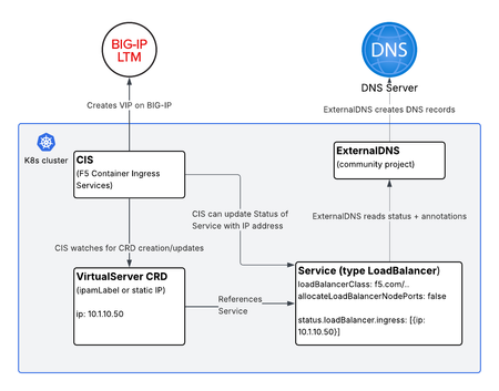 Overview F5 Container Ingress Services (CIS) is a powerful way to manage BIG-IP configuration directly from Kubernetes. Using CIS Custom Resource Definitions (CRDs) like VirtualServer and TransportServer, you can define rich traffic management policies in native Kubernetes manifests and have CIS automatically create and update Virtual IPs (VIPs) on BIG-IP. One common question that comes up: “What if I want DNS records created automatically when a VirtualServer comes up, but I’m not using F5 DNS?” This article answers exactly that question. We’ll walk through how to combine CIS VirtualServer resources with the community project ExternalDNS to automatically register DNS records on external DNS providers like AWS Route 53, Infoblox, CoreDNS, Azure DNS, and others — all without touching a zone file by hand. Background: How DNS Automation Typically Works in Kubernetes Before diving into the solution, it’s worth grounding ourselves in how DNS automation normally works in Kubernetes. The Standard Pattern: Services of Type LoadBalancer The most common pattern is: Create a Service of type LoadBalancer. A cloud controller (or a bare-metal equivalent like MetalLB) assigns an external IP and updates the status.loadBalancer.ingress field of the Service object. ExternalDNS watches for Services of type LoadBalancer with specific annotations, reads the IP from the status field, and creates a DNS A record on your external DNS server. This is clean, well-understood, and widely supported. ExternalDNS can also watch Ingress objects or Services of type ClusterIP and NodePort, but the LoadBalancer pattern is the most common integration point. Where F5 CIS Fits In CIS supports creating VIPs on BIG-IP in multiple ways: VirtualServer / TransportServer CRDs — Most customers prefer to use VS or TS CRDs because they expose rich BIG-IP capabilities: iRules, custom persistence profiles, health monitors, TLS termination policies, and more. This is where the DNS automation story gets more nuanced and is the focus of this article. Service of type LoadBalancer — CIS watches for Services of type LoadBalancer. Typically an IPAM controller or a custom annotation will be used to configure an IP address. CIS allocates a VIP on BIG-IP. This is not the focus of this article. Other — CIS can also use Ingress or ConfigMap resources, but these are more historical approaches, not recommended for new deployments, and out of scope for this article. The Gap: F5 CRDs and Non-F5 DNS CIS does include its own ExternalDNS CRD (not to be confused with the community project of the same name). However, F5’s built-in ExternalDNS CRD only supports F5 DNS (BIG-IP DNS / GTM). If you’re using Route 53, Infoblox, PowerDNS, or any other DNS provider, you need a different approach. That’s where the community ExternalDNS project comes in. The Solution: VirtualServer + Service of Type LoadBalancer + ExternalDNS The trick is straightforward once you see it: CIS can manage a VIP on BIG-IP via a VirtualServer CRD while simultaneously updating the status field of a Service of type LoadBalancer. ExternalDNS then reads that status field and creates DNS records. Let’s walk through the manifests. Step-by-Step Walkthrough Step 1: Deploy Your Application A standard Deployment — nothing special here. apiVersion: apps/v1 kind: Deployment metadata: name: my-app namespace: my-namespace spec: replicas: 2 selector: matchLabels: app: my-app template: metadata: labels: app: my-app spec: containers: - name: my-app image: my-app:latest ports: - containerPort: 8080 Step 2: Create the Service of Type LoadBalancer This Service is the linchpin of the whole solution. It serves three purposes: It acts as a target for the CIS VirtualServer pool (either via NodePort or directly to pod IPs in cluster mode). CIS updates its status.loadBalancer.ingress field with the BIG-IP VIP address. ExternalDNS reads its status and annotations to create a DNS record. apiVersion: v1 kind: Service metadata: name: my-app-svc namespace: my-namespace annotations: # ExternalDNS annotation — tells ExternalDNS what hostname to register external-dns.alpha.kubernetes.io/hostname: myapp.example.com # Optional: set a custom TTL external-dns.alpha.kubernetes.io/ttl: "60" spec: selector: app: my-app ports: - port: 80 targetPort: 8080 protocol: TCP type: LoadBalancer # Prevent other LB controllers from acting on this Service loadBalancerClass: f5.com/bigip # Do not allocate NodePort endpoints — more on this below allocateLoadBalancerNodePorts: false Two fields here deserve extra explanation. loadBalancerClass: f5.com/bigip In a typical cluster, multiple controllers may be watching for Services of type LoadBalancer — MetalLB, the cloud provider controller, etc. If you’re using CIS VirtualServer CRDs to manage the VIP (rather than having CIS act directly as a LoadBalancer controller for this Service), you likely don’t want any of those other controllers touching this Service. Setting loadBalancerClass to a value that no other running controller claims means this Service will be ignored by all LB controllers except the one that explicitly handles that class. In this pattern, you want CIS to "see" this service, but not other controllers. So use the CIS argument --load-balancer-class=f5.com/bigip here. Note: The value of loadBalancerClass in your Service should match the value of load-balancer-class in your CIS deployment. The goal is to prevent unintended controllers from assigning IPs or creating cloud load balancers for this Service. allocateLoadBalancerNodePorts: false By default, LoadBalancer Services in Kubernetes allocate NodePort endpoints. This means traffic could reach your pods directly via : — bypassing BIG-IP, security policies, and your iRules. Setting allocateLoadBalancerNodePorts: false prevents this. The Service effectively behaves like a ClusterIP service in terms of access — the only way to reach it from outside the cluster is via the BIG-IP VIP. This is 