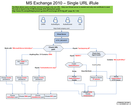 So let’s start today by looking at some of the key features of iApp using the F5 Exchange 2010 template as an example. A user would select a template they wished to use from a drop down field in the user interface. Once selected, they will be presented with the questions and input fields defined by the iApp author. It looks like this…… F5-provided iApp templates all have key features that help bridge that IT knowledge gap I spoke about previously. Goal-based configuration - Goal-based questions are used to translate industry jargon into terms more appropriate to the end-user’s goal. An example of this is when we refer to a specific servers IP address, rather than calling it a node (an F5-specific term). Application specific - We use vendor referenced names, such as autodiscover and ActiveSync(tm) that enable the network team to speak the application team’s language to get more accurate and faster results. Inline help - Inline help is also added where needed to give additional information to help the user make the appropriate choice for their environment or to notify them of any related impact to system performance or security. Dynamic questions - F5-provided iApps allow the user to determine which application roles apply to their environment and only show the questions necessary for configuring those services. F5 module aware - Templates will ask you if you wish to provide acceleration and/or security services for your application based on licensed F5 modules. All these features enable IT network and application teams to bridge the knowledge and language gap to extract application knowledge that is unique to their environment. This significantly improves the accuracy and speed of their deployment. One possible side effect might just be the network and application folks getting along a little better. I am not talking about IT world peace, but maybe a marked reduction in finger pointing and frustration. Or perhaps even a friendly, “Hello, how are you doing?” at the coffee machine. If you don’t believe that can happen yet, let me show you one other major benefit of F5-provided iApp templates. Remember when I said in the last paragraph, “application knowledge that is unique to their environment?” That’s because anything that is not unique to the environment is auto configured for the user! We have taken our years of hands-on experience with applications and our business partners to develop configuration that optimizes the network for mission critical applications in a matter of minutes. Using our Exchange example that means nearly 90% of the configuration is done for you, and not only is your network optimized for high availability, but security and acceleration too. That means a huge reduction in time spent readying your network for your application and as well as chances for misconfigurations. *game changing*267Views0likes0CommentsMicrosoft Exchange 2010 iRule Workflow Visualized