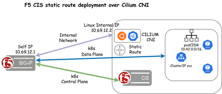 F5 Container Ingress Services (CIS) supports static route configuration to enable direct routing from F5 BIG-IP to Kubernetes/OpenShift Pods as an alternative to VXLAN tunnels. Static routes are enabled in the F5 CIS CLI/Helm yaml manifest using the argument --static-routing-mode=true. In this article, we will use Cilium as the Container Network Interface (CNI) and configure static routes for an NGINX deployment For initial configuration of the BIG-IP, including AS3 installation, please see https://clouddocs.f5.com/products/extensions/f5-appsvcs-extension/latest/userguide/installation.html and https://clouddocs.f5.com/containers/latest/userguide/kubernetes/#cis-installation The first step is to install Cilium CNI using the steps below on Linux host: CILIUM_CLI_VERSION=$(curl -s https://raw.githubusercontent.com/cilium/cilium-cli/main/stable.txt) CLI_ARCH=amd64 if [ "$(uname -m)" = "aarch64" ]; then CLI_ARCH=arm64; fi curl -L --fail --remote-name-all https://github.com/cilium/cilium-cli/releases/download/${CILIUM_CLI_VERSION}/cilium-linux-${CLI_ARCH}.tar.gz{,.sha256sum} sha256sum --check cilium-linux-${CLI_ARCH}.tar.gz.sha256sum sudo tar xzvfC cilium-linux-${CLI_ARCH}.tar.gz /usr/local/bin rm cilium-linux-${CLI_ARCH}.tar.gz{,.sha256sum} cilium install --version 1.18.5 cilium status cilium status --wait root@ciliumk8s-ubuntu-server:~# cilium status --wait /¯¯\ /¯¯\__/¯¯\ Cilium: OK \__/¯¯\__/ Operator: OK /¯¯\__/¯¯\ Envoy DaemonSet: OK \__/¯¯\__/ Hubble Relay: disabled \__/ ClusterMesh: disabled DaemonSet cilium Desired: 1, Ready: 1/1, Available: 1/1 DaemonSet cilium-envoy Desired: 1, Ready: 1/1, Available: 1/1 Deployment cilium-operator Desired: 1, Ready: 1/1, Available: 1/1 Containers: cilium Running: 1 cilium-envoy Running: 1 cilium-operator Running: 1 clustermesh-apiserver hubble-relay Cluster Pods: 6/6 managed by Cilium Helm chart version: 1.18.3 Image versions cilium quay.io/cilium/cilium:v1.18.3@sha256:5649db451c88d928ea585514746d50d91e6210801b300c897283ea319d68de15: 1 cilium-envoy quay.io/cilium/cilium-envoy:v1.34.10-1761014632-c360e8557eb41011dfb5210f8fb53fed6c0b3222@sha256:ca76eb4e9812d114c7f43215a742c00b8bf41200992af0d21b5561d46156fd15: 1 cilium-operator quay.io/cilium/operator-generic:v1.18.3@sha256:b5a0138e1a38e4437c5215257ff4e35373619501f4877dbaf92c89ecfad81797: 1 cilium connectivity test root@ciliumk8s-ubuntu-server:~# cilium connectivity test ℹ️ Monitor aggregation detected, will skip some flow validation steps ✨ [default] Creating namespace cilium-test-1 for connectivity check... ✨ [default] Deploying echo-same-node service... ✨ [default] Deploying DNS test server configmap... ✨ [default] Deploying same-node deployment... ✨ [default] Deploying client deployment... ✨ [default] Deploying client2 deployment... ✨ [default] Deploying ccnp deployment... ⌛ [default] Waiting for deployment cilium-test-1/client to become ready... ⌛ [default] Waiting for deployment cilium-test-1/client2 to become ready... ⌛ [default] Waiting for deployment cilium-test-1/echo-same-node to become ready... ⌛ [default] Waiting for deployment cilium-test-ccnp1/client-ccnp to become ready... ⌛ [default] Waiting for deployment cilium-test-ccnp2/client-ccnp to become ready... ⌛ [default] Waiting for pod cilium-test-1/client-645b68dcf7-s5mdb to reach DNS server on cilium-test-1/echo-same-node-f5b8d454c-qkgq9 pod... ⌛ [default] Waiting for pod cilium-test-1/client2-66475877c6-cw7f5 to reach DNS server on cilium-test-1/echo-same-node-f5b8d454c-qkgq9 pod... ⌛ [default] Waiting for pod cilium-test-1/client-645b68dcf7-s5mdb to reach default/kubernetes service... ⌛ [default] Waiting for pod cilium-test-1/client2-66475877c6-cw7f5 to reach default/kubernetes service... ⌛ [default] Waiting for Service cilium-test-1/echo-same-node to become ready... ⌛ [default] Waiting for Service cilium-test-1/echo-same-node to be synchronized by Cilium pod kube-system/cilium-lxjxf ⌛ [default] Waiting for NodePort 10.69.12.2:32046 (cilium-test-1/echo-same-node) to become ready... 🔭 Enabling Hubble telescope... ⚠️ Unable to contact Hubble Relay, disabling Hubble telescope and flow validation: rpc error: code = Unavailable desc = connection error: desc = "transport: Error while dialing: dial tcp 127.0.0.1:4245: connect: connection refused" ℹ️ Expose Relay locally with: cilium hubble enable cilium hubble port-forward& ℹ️ Cilium version: 1.18.3 🏃[cilium-test-1] Running 126 tests ... [=] [cilium-test-1] Test [no-policies] [1/126] .................... [=] [cilium-test-1] Skipping test [no-policies-from-outside] [2/126] (skipped by condition) [=] [cilium-test-1] Test [no-policies-extra] [3/126] <- snip -> For this article, we will install k3s with Cilium CNI root@ciliumk8s-ubuntu-server:~# curl -sfL https://get.k3s.io | sh -s - --flannel-backend=none --disable-kube-proxy --disable servicelb --disable-network-policy --disable traefik --cluster-init --node-ip=10.69.12.2 --cluster-cidr=10.42.0.0/16 root@ciliumk8s-ubuntu-server:~# mkdir -p $HOME/.kube root@ciliumk8s-ubuntu-server:~# sudo cp -i /etc/rancher/k3s/k3s.yaml $HOME/.kube/config root@ciliumk8s-ubuntu-server:~# sudo chown $(id -u):$(id -g) $HOME/.kube/config root@ciliumk8s-ubuntu-server:~# echo "export KUBECONFIG=$HOME/.kube/config" >> $HOME/.bashrc root@ciliumk8s-ubuntu-server:~# source $HOME/.bashrc API_SERVER_IP=10.69.12.2 API_SERVER_PORT=6443 CLUSTER_ID=1 CLUSTER_NAME=`hostname` POD_CIDR="10.42.0.0/16" root@ciliumk8s-ubuntu-server:~# cilium install --set cluster.id=${CLUSTER_ID} --set cluster.name=${CLUSTER_NAME} --set k8sServiceHost=${API_SERVER_IP} --set k8sServicePort=${API_SERVER_PORT} --set ipam.operator.clusterPoolIPv4PodCIDRList=$POD_CIDR --set kubeProxyReplacement=true --helm-set=operator.replicas=1 root@ciliumk8s-ubuntu-server:~# cilium config view | grep cluster bpf-lb-external-clusterip false cluster-id 1 cluster-name ciliumk8s-ubuntu-server cluster-pool-ipv4-cidr 10.42.0.0/16 cluster-pool-ipv4-mask