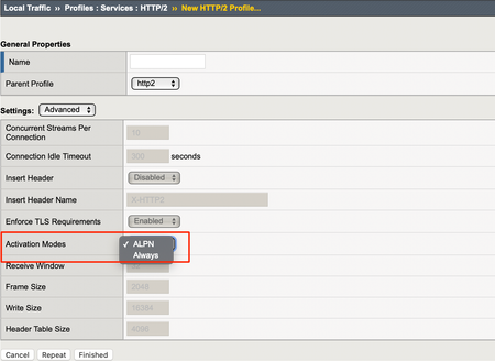 Hi all, I have a config here with APM and users are login to a full webtop. Version used is v13.1.0.1. Now, for a test I changed the VS to support HTTP/2 and added a http/2 profile to the VS. When we connect we get the following error in /var/log/ltm: Jan 15 14:14:19 bigip1 err tmm1[12276]: 01220001:3: TCL error: /Common/_sys_APM_VDI_Helper - can't read "tmm_apm_client_type": no such variable while executing "if { ($tmm_apm_uri_path equals "/broker/xml") || ($tmm_apm_user_agent equals "VMware-client") } { set tmm_apm_client_type "view-xml" ..." So is APM not HTTP/2 ready yet? Thanks for a reply, PeterSolved917Views0likes2CommentsUnderstanding HTTP/2 Activation Modes on BIG-IP
