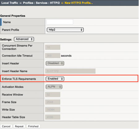 Introduction For those new to HTTP/2 profile, RFC7540 section 9.2.1 specifies TLS requirements for HTTP/2 connections. On BIG-IP, there's an option that is enabled by default which makes BIG-IP comply with above RFC requirements: The above setting dictates whether BIG-IP should enforce TLS configuration requirements during client SSL profile configuration. In this article, I will talk about such RFC requirements in the context of BIG-IP configuration.. BIG-IP requires Client SSL profile before adding HTTP/2 profile BIG-IP does not allow us to add an HTTP/2 profile without adding a Client SSL profile first as HTTP/2 requires TLS: TLS Renegotiation must be disabled on Client SSL profile The other requirement is that we must explicitly disable Renegotiation on Client SSL profile: In the above example, I first added a Client SSL profile (https-vip-client-ssl) to my virtual server (http_test) and then tried adding an HTTP/2 profile (custom_http2_profile) and it fails because TLS Renegotiation is enabled on my Client SSL profile. After disabling TLS Renegotiation, I can now safely add my HTTP/2 profile to virtual server: TLS Cipher Enforcement and TLS Compression Do not use any of the cipher suites from Appendix A from RFC7540: Roughly all ciphers that are not ephemeral and cipher mode CBC. Ephemeral ciphers such as ECDHE are allowed. You don't need to worry about making any changes here because BIG-IP will proactively either select the ciphers that are compatible with HTTP/2 from Cipher list (sent by client on Client Hello message) or an error (INSUFFICIENT_SECURITY) will be triggered. However, it is worth pointing out that after a profile is applied to a virtual server, we do not allow removing compatible ciphers from Cipher List as seen below: Regarding TLS compression, we do not support it anyway so nothing to worry about. Final Remarks I would personally leave Enforce TLS Requirements setting enabled to both comply with RFC and for security reasons. For more details, please check the TLS requirements section in RFC.1.6KViews0likes0CommentsGoodbye SPDY, Hello HTTP/2