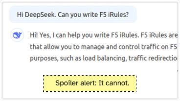 Back in time... Two years ago I asked ChatGPT whether it could write iRules. My conclusion after giving several tasks to ChatGPT was, that it can help with simple tasks but it cannot write intermediate or complex iRules. A new AI enters the competition Two weeks ago DeepSeek entered the scene and thought it's a good idea to ask it about its capabilities to write iRules. Spoiler alert: It cannot. New AI, same challenges I asked DeepSeek the same questions I asked ChatGPT 2 years ago. Write me an iRule that redirects HTTP to HTTPS Can you write an iRule that rewrites the host header in HTTP Request and Response? Can you write an iRule that will make a loadbalancing decision based on the HTTP Host header? Can you write an iRule that will make a loadbalancing decision based on the HTTP URI header? Write me an iRule that shows different ASM blocking pages based on the host header. The response should include the support ID. I stopped DeepSeek asking after the 5th question, DeepSeek is clueless about iRules. The answer I got from DeepSeek to 1, 2, 4 and 5 was always the same: when HTTP_REQUEST { # Check if the request is coming to port 80 (HTTP) if { [TCP::local_port] equals 80 } { # Construct the HTTPS URL set host [HTTP::host] set uri [HTTP::uri] set redirect_url "https://${host}${uri}" # Perform the redirect HTTP::redirect $redirect_url } } While this is a solution to task 1, it is plain wrong for 2, 3, 4 and 5. And even for the first challenge this is not a good. Actually it hurts me reading this iRule... Here for example task 2, just wrong... For task 3 DeepSeeks answer was: ChatGPT in 2025 For completeness, I gave the same tasks from 2023 to ChatGPT again. Briefly said - ChatGPT was OK in solving tasks 1-4 in 2023 and still is. It improved it's solution for task 5, the ASM iRule challenge. In 2023 I had two more tasks related to rewriting and redirecting. ChatGPT still failed to provide a solid solution for those two tasks. Conclusion DeepSeek cannot write iRules and ChatGPT still isn't good at it. Write your own iRules or ask the friendly people here on devcentral to help you.932Views7likes14Comments