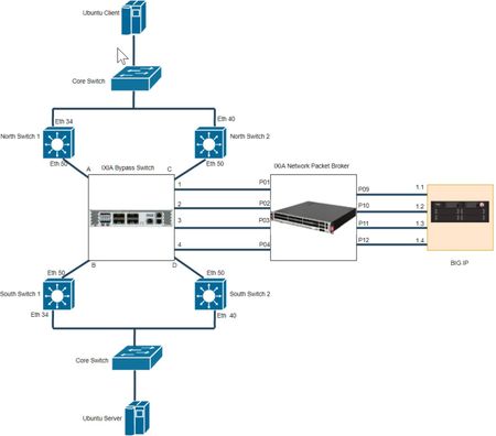 Introduction This article is part of a series on deploying BIG-IPs with bypass switches and network packet brokers. These devices allow for the transparent integration of network security tools with little to no network redesign and configuration change. For more information about bypass switch devices refer to https://en.wikipedia.org/wiki/Bypass_switch; for network packet brokers, refer to https://www.ixiacom.com/company/blog/network-packet-brokers-abcs-network-visibility and https://www.gigamon.com/campaigns/next-generation-network-packet-broker.html. The article series introduces network designs to forward traffic to the inline tools at layer 2 (L2). F5’s BIG-IP hardware appliances can be inserted in L2 networks. This can be achieved using either virtual Wire (vWire) or by bridging 2 Virtual LANs using a VLAN Groups. This document covers the design and implementation of the IXIA Bypass Switch/Network Packet Broker in conjunction with the BIG-IP i5800 appliance and Virtual Wire (vWire). This document focuses on IXIA Bypass Switch / Network Packet Broker. For more information about architecture overview of bypass switch and network packet broker refer to https://devcentral.f5.com/s/articles/L2-Deployment-of-vCMP-guest-with-Ixia-network-packet-broker?tab=series&page=1. This article focuses on Active / Standby configuration of Inline Tool Port Pairs in IXIA NPB Network Topology Below diagram is a representation of the actual lab network. This shows deployment of BIG-IP with IXIA Bypass Switch and Network Packet Broker. Figure 1 - Deployment of BIG-IP with IXIA Bypass Switch and Network Packet Broker Please refer Lab Overview section in https://devcentral.f5.com/s/articles/BIG-IP-L2-Deployment-with-Bypasss-Network-Packet-Broker-and-LACP?tab=series&page=1 for more insights on lab topology and connections. Hardware Specification Hardware used in this article are IXIA iBypass DUO ( Bypass Switch) IXIA Vision E40 (Network Packet Broker) BIG-IP Arista DCS-7010T-48 (all the four switches) Software Specification Software used in this article are BIG-IP 16.1.0 IXIA iBypass DUO 1.4.1 IXIA Vision E40 5.9.1.8 Arista 4.21.3F (North Switches) Arista 4.19.2F (South Switches) Switch and Ixia iBypass Duo Configuration Switch and IXIA iBypass configurations are same as mentioned in below article https://devcentral.f5.com/s/articles/BIG-IP-L2-Virtual-Wire-LACP-Passthrough-Deployment-with-IXIA-Bypass-Switch-and-Network-Packet-Broker-I IXIA Vision E40 Configuration Most of the configurations are same as mentioned in https://devcentral.f5.com/s/articles/BIG-IP-L2-Virtual-Wire-LACP-Passthrough-Deployment-with-IXIA-Bypass-Switch-and-Network-Packet-Broker-I. In this article Inline Tool Port pairs are configured as Active/ Standby in Tool Resources as below Figure 2 - Configuration of Tool Resources Here BIG IP1 Inline Tool Port Pair is Active and BIG IP2 Inline Tool Port Pair is Standby. Traffic will be passing through BIG IP1 Inline Tool Port Pair initially and once it is down then BIG IP2 will become active BIG-IP Configuration Most of the configurations are same as mentioned in https://devcentral.f5.com/s/articles/BIG-IP-L2-Virtual-Wire-LACP-Passthrough-Deployment-with-IXIA-Bypass-Switch-and-Network-Packet-Broker-I. In this article, vWire is configured with Links State Propagation disabled as below Figure 3 - Configuration of Virtual Wire Note: As we covered Propagate Virtual Wire Link Status enabled in previous article, here plan is to disable Propagate Virtual Wire Link Status and test the scenarios. Both the Enabling and disabling of Link state Propagation work for both Active / Active and Active / Standby configuration of Inline Tool Port Pair in NPB. Scenarios As LACP passthrough mode configured in BIG-IP, LACP frames will passthrough BIG-IP. LACP will be established between North and South Switches. ICMP traffic is used to represent network traffic from the north switches to the south switches. Scenario 1: Traffic flow through BIG-IP with North and South Switches configured in LACP active mode Above configurations shows that all the four switches are configured with LACP active mode. Figure 4 - MLAG after deployment of BIG-IP and IXIA with Switches configured in LACP ACTIVE mode Figure 4 shows that port-channels 513 is active at both North Switches and South Switches. Figure 5 - ICMP traffic flow from client to server through BIG-IP Figure 5 shows ICMP is reachable from client to server through BIG-IP. This verifies test case 1, LACP getting established between Switches and traffic passthrough BIG-IP successfully. Scenario 2: Active BIG-IP link goes down with link state propagation disabled in BIG-IP Figure 3 shows Propagate Virtual Wire Link Status enabled in BIG-IP. Figure 5 shows that interface 1.1 of BIG-IP is active incoming interface and interface 1.4 of BIG-IP is active outgoing interface. Disabling BIG-IP interface 1.1 will make active link down as below Figure 6 - BIG-IP interface 1.1 disabled Figure 7 - Trunk state after BIG-IP interface 1.1 disabled Figure 7 shows that the trunks are up even though interface 1.1 is down. As per configuration, North_Trunk has 2 interfaces connected to it 1.1 and 1.3 and one of the interface is still up, so North_Trunk status is active. Figure 8 - MLAG status with interface 1.1 down and Link State Propagation disabled Figure 8 shows that port-channel 513 is active at both North Switches and South Switches. This shows that switches are not aware of link failure and it is been handled by IXIA configuration. Figure 9 - IXIA Bypass Switch after 1.1 interface of BIG-IP goes down As Single Service Chain is configured and which will be down only if both Inline Tool Port pairs are down in NPB. So Bypass will be enabled only if Service Chain goes down in NPB. Figure 9 shows that still Bypass is not enabled in IXIA Bypass Switch. Figure 10 - Service Chain and Inline Tool Port Pair status in IXIA Vision E40 ( NPB ) Figure 10 shows that Service Chain is still up as BIG I