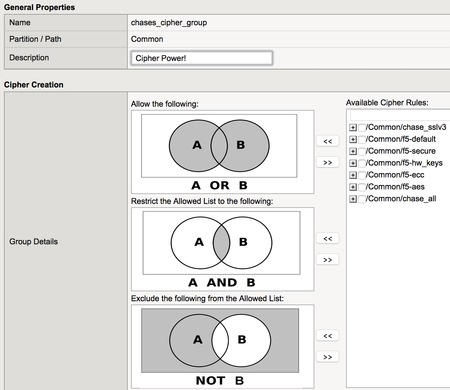 My mother used to always tell me two things before I left for school in the morning. Be wary of what ciphers your application supports Never use the Default cipher list unless you have compatibility concerns You may have had a different upbringing from me but my mom's lessons still apply to anyone using SSL/TLS enabled systems. We know from Señor Wagnon's Security Sidebar: Improving Your SSL Labs Test Grade how cumbersome modifying lengthy cipher strings can be to keep your SSL Labs A grade. We know as BIG-IP matures we update the DEFAULT cipher list to remove deprecated entries and introduce fancy new ones. This causes negative affects on those legacy applications we like to keep lying around. Lastly, we know that not everyone appreciates meditating in SSH sessions; pondering countless tmm --clientciphers commands to figure out what cipher string they'll need in order to get achieve an SSL Labs A+ grade. We have a solution for you. Cipher Rules & Groups BIG-IP version 13 introduces Cipher Rules & Groups; an alternate way to visualize, organize, and apply cipher suites to your client and ssl profiles. You still need a basic understanding of cipher strings and I recommend you review Megazone's article: Cipher Suite Practices and Pitfalls article before gallivanting through Cipher Rules & Groups; you'll stub a toe. Cipher rules and the subsequent groups that contain them allow the same boolean operators used in tmm cipher strings. Boolean Operations in Cipher Groups UNION = Allow the following: INTERSECT = Restrict the Allowed List to the following: DIFFERENCE =Exclude the following from the Allowed List: F5 includes 5 default cipher rules and applies them via 5 default cipher groups of the same name (included is the tmm command to view each cipher list used): f5-aes = tmm --clientciphers AES f5-default = tmm --clientciphers DEFAULT f5-ecc = tmm --clientciphers ECDHE:ECDHE_ECDSA f5-secure = tmm --clientciphers ECDHE:RSA:!SSLV3:!RC4:!EXP:!DES f5-hw_keys = tmm --clientciphers 'ECDHE-RSA-AES256-GCM-SHA384:ECDHE-RSA-AES256-SHA384:ECDHE-RSA-AES256-CBC-SHA:DHE-RSA-AES256-GCM-SHA384:DHE-RSA-AES256-SHA256:DHE-RSA-AES256-SHA:ECDH-RSA-AES256-GCM-SHA384:ECDH-RSA-AES256-SHA384:ECDH-RSA-AES256-SHA:AES256-GCM-SHA384:AES256-SHA256:AES256-SHA:ECDHE-RSA-DES-CBC3-SHA:DHE-RSA-DES-CBC3-SHA:ECDH-RSA-DES-CBC3-SHA:DES-CBC3-SHA:ECDHE-RSA-AES128-GCM-SHA256:ECDHE-RSA-AES128-SHA256:ECDHE-RSA-AES128-CBC-SHA:DHE-RSA-AES128-GCM-SHA256:DHE-RSA-AES128-SHA256:DHE-RSA-AES128-SHA:ECDH-RSA-AES128-GCM-SHA256:ECDH-RSA-AES128-SHA256:ECDH-RSA-AES128-SHA:AES128-GCM-SHA256:AES128-SHA256:AES128-SHA:RC4-SHA:RC4-MD5:DHE-RSA-DES-CBC-SHA:DHE-RSA-CAMELLIA256-SHA:CAMELLIA256-SHA:DHE-RSA-CAMELLIA128-SHA:!TLSv1:!TLSv1_1:!SSLv3:!DTLSv1 The last one related to HSM ciphers was crazy long wasn't it. This is why we built cipher rules and groups; to prevent you from banging your head on the table because you got the operand wrong somewhere after ECDHE-RSA-AES128-GCM-SHA256. The F5 provided rules and groups are read-only and should used as a reference or starting template. If you rely only on the default F5 cipher rules/groups they will change as our cryptographic requirements change and you could end up with a bunch of incompatible legacy clients. Building A Cipher Rule Because Cipher Rules and Groups are applied to SSL Profiles, you can find them under Local Traffic in the web GUI. Clicking into Local Traffic => Ciphers gives you two options: Cipher Rules and Cipher Groups. I'll create one Cipher Rule based on tmm cipher string ALL:SSLv3:EXPORT. This is only for display purposes to better illustrate the boolean operations when we build the Cipher Group. Current ciphers based on BIG-IP version and Hotfix are listed in the NATIVE cipher list. Remember, we have to support a lot of ciphers that may not be appropriate for public consumption. Building Cipher Groups Now we'll build a Cipher Group starting with the chase_all Cipher Rule, because we're gluttons for punishment. Clicking the + expands the ciphers allowed under each Cipher Rule. Adding it to the "Allow the following" element, the Cipher Audit element below will automatically update to reflect the ciphers this group will provide the Client or Server Profile. Remember, anything added in that window is performing a Boolean Union operation. Adding the f5-aes Cipher Rule to the "Restrict the Allowed List to the following:" element which will reduce the chase_all cipher list to only ciphers common to both ALL:SSLv3:EXPORT and AES lists; performing a Boolean Intersection operation. The Cipher Audit element shows the results and we can see those pesky RC4-MD5 suites from EXPORT are gone, but ew... we have some SSLv3-enabled ciphers and we want those out. I'll create a new Cipher Rule called chase_sslv3 with the cipher string only being SSlv3. I'll add this new Cipher Rule to the "Exclude the following from the Allowed List:"; performing a Boolean Difference operation. We can also change the cipher sorting based on speed, strength, FIPS, or hardware accelerated via the Order dropdown. Ahh.... better, now we've paired down a horribly insecure cipher list with the intersection of the AES ciphers and exclusion of the SSlv3s. Yea, we could have started with the AES Cipher Rule as the base list but that's not as fun for this demonstration. The lifecycle of a BIG-IP SSL profile requires active management of cipher suites. This demo illustrates the flexability of additive/subtractive cipher management which reduces the complexity of recreating the wheel every time someone nullifies the security of existing algorithms or hash functions. Applying Cipher Groups to Client/Server Profiles Open an SSL Client or Server Profile and change the configuration to advanced. The cipher list becomes available and is defaulted to a Cipher String. Now you have a radio button for Cipher Group, selecting the newly created object or click the + button to create one from scratch. TMSH Support for Cipher Rules and Groups We h