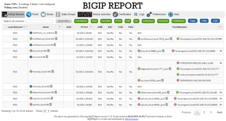 Problem this snippet solves: This codeshare has been deprecated due to a hosting platform corruption. I have moved code and conversation to a new record (on the same original URL) https://devcentral.f5.com/s/articles/bigip-report can be Overview This is a script which will generate a report of the BigIP LTM configuration on all your load balancers making it easy to find information and get a comprehensive overview of virtual servers and pools connected to them. This information is used to relay information to our NOC and developers to give them insight in where things are located and to be able to plan patching and deploys. I also use it myself as a quick way get information or gather data used as a foundation for RFC's, ie get a list of all external virtual servers without compression profiles. The script has been running on 13 pairs of load balancers, indexing over 1200 virtual servers for several years now and the report is widely used across the company and by many companies and governments across the world. It's easy to setup and use and only requires guest permissions on your devices. Demo/Preview Please note that it takes time to make these so sometimes they're a bit outdated and they only cover one HA pair. However, they still serve the purpose of showing what you can expect from the report. Interactive demo http://loadbalancing.se/bigipreportdemo/ Screen shots The main report: The device overview: Certificate details: How to use this snippet: This codeshare has been deprecated due to a hosting platform corruption. I have moved code and conversation to a new record (on the same original URL) https://devcentral.f5.com/s/articles/bigip-report Installation instructions BigipReport REST This is the only branch we're updating since middle of 2020 and it supports 12.x and upwards (maybe even 11.6). Download: https://loadbalancing.se/downloads/bigipreport-v5.5.4.zip Documentation, installation instructions and troubleshooting: https://loadbalancing.se/bigipreport-rest/ Docker support This will be the recommended way of running bigipreport in the near future. It's still undergoing testing but it's looking really good so far. https://loadbalancing.se/2021/01/05/running-bigipreport-on-docker/ BigipReport (Legacy) Older version of the report that only runs on Windows and is depending on a Powershell plugin originally written by Joe Pruitt (F5). BigipReport (Stable): https://loadbalancing.se/downloads/bigipreport-5.3.1.zip BigipReport (BETA): https://loadbalancing.se/downloads/bigipreport-5.4.0-beta.zip iControl Snapin: https://loadbalancing.se/downloads/f5-icontrol.zip Documentation and installation instructions: https://loadbalancing.se/bigip-report/ Upgrade instructions Protect the report using APM and active directory Written by DevCentral member Shann_P: https://loadbalancing.se/2018/04/08/protecting-bigip-report-behind-an-apm-by-shannon-poole/ Got issues/problems/feedback? Still have issues? Drop a comment below. We usually reply quite fast. Any bugs found, issues detected or ideas contributed makes the report better for everyone, so it's always appreciated. --- Also trying out a Discord channel now. You're welcome to hang out with us there: https://discord.gg/7JJvPMYahA Code : 85931,86647,90730 Tested this on version: 13.028KViews16likes974CommentsPowerShell module for the F5 LTM REST API