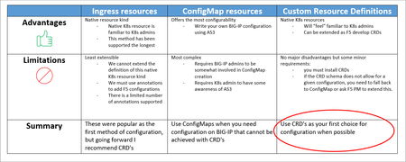 Summary F5 Container Ingress Services (CIS) now supports the use of Custom Resource Definitions (CRD's) in Kubernetes (K8s) as a method for configuring services on the BIG-IP. This article walks through my first time deploying and what I learned. Goal of this article The goal of this article is to demonstrate that you can easily configure services on BIG-IP using CRD's, and this makes the configuration of services on F5 BIG-IP feel like a native Kubernetes experience, since you are creating Kubernetes resources. Other ways to configure BIG-IP from K8s Before F5 CIS supported CRD's, you could already use Ingress resources or ConfigMap resources to create VIPs and pool members on F5. Using CRD's now gives us a new way. As I found in my first deployment, the advantage of CRDs over Ingress resources is that F5 can develop their own CRD and have more attributes that can map to configurations in BIG-IP. And again based on my first impressions, the advantage of CRDs over ConfigMaps is that you don't need to create an AS3 declaration yourself. You now get to do that via a Kubernetes resource. This table summarizes my opinion only: Overview of my demo architecture Here's an image of the cloud infrastructure I built. Basically I have a pair of BIG-IP devices in Active/Standby config, and the K8s cluster is integrated via CIS. Here's a more application-focused image of what is deployed. NGINX Ingress Controller (open source version) is used here as an ingress controller running inside Kubernetes. What is this resource of kind VirtualServer doing? Here is the definition of my VirtualServer resource and the related TLSProfile resource: apiVersion: "cis.f5.com/v1" kind: VirtualServer metadata: name: hello-world-virtual-server namespace: nginx-ingress labels: f5cr: "true" spec: tlsProfileName: hello-world-tls # --> This will attach hello-world-tls TLSProfile virtualServerAddress: "10.0.2.100" pools: - path: / service: nginx-ingress servicePort: 80 monitor: type: http interval: 10 timeout: 31 send: "/" --- apiVersion: cis.f5.com/v1 kind: TLSProfile metadata: name: hello-world-tls namespace: nginx-ingress labels: f5cr: "true" spec: tls: termination: edge clientSSL: /Common/clientssl reference: bigip # --> reference profiles created in BIG-IP by User hosts: - hello-world.example.com Now, the above resources will create objects in the BIG-IP config. I'll take a screenshot of what's created in BIG-IP and highlight some fields that you can see were configured by the resources above. Run this demo yourself (code not supported) Here's a link to my Github repo if you want to see the resources created. I've included instructions for deploying this demo environment, for educational purposes only. I'll use this as a tool for showing others but this will not be a supported solution long term. Conclusion You can use CRD's to configure F5 services from within Kubernetes. This means the Kubernetes admins can configure BIG-IP themselves, without the traditional network admin who normally "owns" F5 being involved. This was possible before CRD's (with Ingress, ConfigMap, or Routes in OpenShift) but with CRD's we have a more native-feeling resource that F5 can now extend with future CIS development.2.9KViews0likes5CommentsNGINX as an HTTP Load Balancer