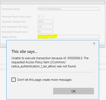 Hello, I have some troubles to edit any block in any per-request policy. I tried it with all browsers. I always get an error "Server request for 'editActionDialogue' is failed: Request status=500". I can not edit any block in any of the per-request policies !?! (But I can edit APM access policy)... Has anyone ever encountered a similar problem? F5 version: 12.1.3.5 0.0.10-Point Release 5 Best regards, SpelaSolved834Views0likes5CommentsAPM Gating Criteria sub-routines
