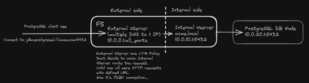 Hi! I got some new challenge for my F5. I have F5 Act/Stb cluster running in Azure, 16.1.3 Big-IP software version. F5 has been divided into 1 external VServer that has LTM policies defined. Based on HTTP Host in request, it decides to which Internal VServer the request should be routed to. It was simple and efficient until I got a task to make F5 a proxy for PostgreSQL DB. Before that I've had new request with HTTP Host: xyz.acme.com, so I added new DNS record pointing to my Big-IP and putting new LTM rule that was forwarding the request to desired new Internal VServer. But now it's a VServer for PostgreSQL connections. A drawing below and a question: How can I create LTM rule that identifies it's SQL connect to PostreSQLand my F5 will route it to desired Internal VServer?Solved1.2KViews1like4Comments