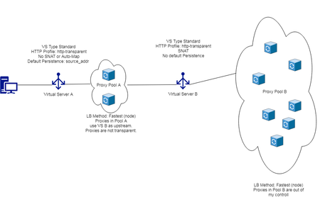 Hello fellow F5-experts, My situation: I try to loadbalance Web-Proxy traffic. In genenal it seems to work, but we've run into some problems relating to websites with weird session handling. I sketched up the environment in the following Image A clients uses VS-A as it's HTTP proxy. This VS loadbalances to two of our own proxies in Pool A. Those are not transparent, so outgoing traffic toward their upstream proxy (VS-B) will have the Pool A node's IP as source address. The Proxies use the HTTP: Connect method. VS-B on the other hand, has a Pool B attached with a lot (as in really a lot) other proxy servers, that are not under our control (but are trustworthy, and have to be used. No way around it). VS-A: Type Standard HTTP-Profile: http-transparent (to be able to use LB method Fastest (node)) Source Address Translation: none Default Persistence Profile: source_addr Pool A: LB Method: Fastest (node) VS-A: Type Standard HTTP-Profile: http-transparent (to be able to use LB method Fastest (node)) Source Address Translation: SNAT Default Persistence Profile: none Pool B: LB Method: Fastest (node) Problem: On some websites, people complain about loosing their sessions. I tracked it down to the VS-B, which can not persist connections to a website to the same node in Pool B. Since the VS-B does not see the original client IP, but only the 2 proxy IP's I have no idea how to establish a propper persistence. For a very important website, i wrote an iRule that "hard-binds" to a single Node in Pool B, based on the HTTP:URI. My question: Is my config any viable? Or what should I change? I read a lot of article here, but I never had the feeling, that those met my situation with the "2-stage" proxy environment. I was thinking about adding a http header with the original client IP by an iRule in VS-A so I have something to make a persistence decision in VS-B, but I'm not sure how to do that. I also often read about applying the OneConnect profile combined with proxy loadbalancing, but I don't think I really understood the reason and/or benefit, nor do I know where to apply it in this environment. I hope I made it some kind of clear what I try to accomplish and where the problems are, since English is not my mother language and I'm a but rusted using it. Any help or hint is very much appreciated. Thanks in advance, ichnafi EDIT:(28th Feb) I just found out, that the desired website can be acquired from the HTTP::host header even by Vs-B. So would it be possible to establish a persinstence for the combination client IP and HTTP::host header? EDIT2: Possible Solution found (1st Mar) I currently endet up with an iRule creating a universal persistence based on the http::host header. the iRule is then bound to a universal Persistense-Profile. The iRule looks lilke this: when HTTP_REQUEST { persist uie [HTTP::host] } I'm thinking of maybe creating a custom header that contains a combination of client_ip and http:host value to get an even more definite persistence, but not quite sure about that. What do you guys think?971Views0likes12CommentsFTp proxy via iRule