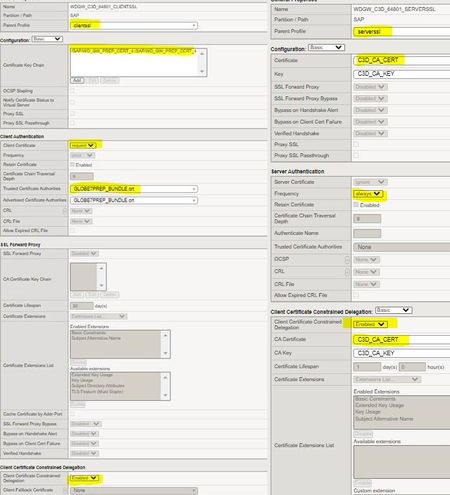 For application new requirement, we need to pass the client certificate to backend server. We enabled the C3D option on the client and server SSL profile. I created the CA certificate and key (https://support.f5.com/csp/article/K14499) and attached to Server SSL profile. The below be the client and Server SSL profile (https://support.f5.com/csp/article/K14065425) . Refer the below settings. Prerequisites: • You must have a CA-Bundle used to validate incoming client certificates. --> Used Company's Certificate Bundle • You must have a Certificate and Key for Reverse Proxy --> Current application certificate • You must have a CA Certificate and Key that has the ability to create new certificates --> Created CA certificate and key from F5 (https://support.f5.com/csp/article/K14499) But when the client try to access application, we are getting SSL handshake error. Any configuration need to correct on F5 or ? Appreciate your help on this. 021-07-12 01:34:31,510 +0000#INFO#com.sap.scc.rt#com.sap.scc.servlets.AccessControlServlet$3# #SccEndpointValidator has thrown exception for HTTPS://141.122.200.74:64801: Received fatal alert: handshake_failure javax.net.ssl.SSLHandshakeException: Received fatal alert: handshake_failure 2021-07-12 01:34:31,510 +0000#INFO#com.sap.scc.ui#com.sap.scc.servlets.AccessControlServlet$3# #Error when checking local connectivity to gatewaypp:64801 --> javax.net.ssl.SSLHandshakeException: Received fatal alert: handshake_failure1KViews0likes5Comments