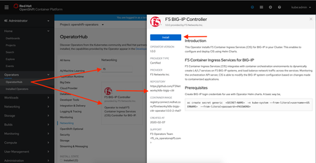 Today A&O PM and PD team announced the availability of Certified F5 BIG-IP Controller Operator (using Helm Charts) on OpenShift 4.x platforms. In this document we discuss about Install, Configure and Deploy CIS using RedHat Certified F5 BIG-IP Controller Operator on OpenShift 4.x Platforms. Introduction What is an Operator? - A method of packaging, deploying and managing a Kubernetes application. A Kubernetes application is an application that is both deployed on Kubernetes and managed using the Kubernetes APIs and kubectl/oc tooling. You can think of Operators as the runtime that manages this type of application on Kubernetes. Conceptually, an Operator takes human operational knowledge and encodes it into software that is more easily packaged and shared with consumers. F5 BIG-IP Controller Operator is a Service Operator which installs F5 BIG-IP Controller (Container Ingress Services) on OpenShift platforms 4.x. Prerequisites OpenShift 4.x BIG-IP (F5 CIS supported versions) In this document we will use Code Ready Containers to install, Configure and deploy CIS using F5 BIG-IP Controller Operator. CRC 1.7.0 installs OCP 4.3.1 on you laptop. Get your suitable image from CRC Repo and follow the instructions to install CRC and bringup your single node OCP 4.3.1 cluster. Install, Configure and Deploy CIS using Operator Accessing OCP 4.3.1 web console From CLI, login as admin using CRC given credentials. $ eval $(crc oc-env) $ oc login -u kubeadmin -p db9Dr-J2csc-8oP78-9sbmf https://api.crc.testing:6443 Here, the username is 'kubeadmin'. and password is 'db9Dr-J2csc-8oP78-9sbmf' to login OCP web console. Installing Operator From the left Menu bar, access Operator Hub and search for "f5" to see the Certified F5 BIG-IP controller Operator in the listing as below. Click on Install to install this Operator. Installing Operator is a guided process. The below screen shows different options to subscribe for this Operator. Select the highlighted options. Click subscribe. Approval Strategy: Manual: Requires administrator approval to install new updates. Automatic: When a new release is available, updated automatic. (default) When Operator is Subscribed, Operator is installed based on approval strategy. An Installed Operator screen is as below. Configuring and Deploying F5 BIG-IP Controller Instance Click on "F5 BIG-IP Controller" or "F5BigIPCtlr" under Provided APIs column to create an Instance of F5 BIG-IP Controller. Creating a F5BigIpCtlr instance screen is as shown below. The Screen provides an editor to configure CIS/F5 BIG-IP Controller with required deployment options. A sample Controller deployment configuration is as shown below apiVersion: cis.f5.com/v1 kind: F5BigIpCtlr metadata: name: f5-server namespace: openshift-operators spec: args: manage_routes: true agent: as3 log_level: DEBUG route_vserver_addr: 172.16.1.4 bigip_partition: ocp openshift_sdn_name: /Common/openshift_vxlan bigip_url: 172.16.2.23 log_as3_response: true insecure: true pool-member-type: cluster bigip_login_secret: f5-bigip-ctlr-login image: pullPolicy: Always repo: k8s-bigip-ctlr user: f5networks namespace: kube-system rbac: create: true resources: {} serviceAccount: create: true version: latest Create BIG-IP controller login secret and update the same in above configuration. Update the YAML and click on Create. Based on Namespace and configuration options, CIS is installed. When Operator deploys the controller, we can see the updated YAML of the CustomResource Instance. An example below. Name: f5-server Namespace: openshift-operators Labels: <none> Annotations: <none> API Version: cis.f5.com/v1 Kind: F5BigIpCtlr Metadata: Creation Timestamp: 2020-02-08T00:31:21Z Finalizers: uninstall-helm-release Generation: 1 Resource Version: 245330 Self Link: /apis/cis.f5.com/v1/namespaces/openshift-operators/f5bigipctlrs/f5-server UID: 546d3890-4a0a-11ea-a1cf-0ef0e3c74fbe spec: args: agent: as3 bigip_partition: ocp bigip_url: 172.16.2.23 insecure: true log_as3_response: true log_level: DEBUG manage_routes: true openshift_sdn_name: /Common/openshift_vxlan pool_member_type: cluster route_vserver_addr: 172.16.1.4 bigip_login_secret: f5-bigip-ctlr-login Image: PullPolicy: Always Repo: k8s-bigip-ctlr Tag: latest User: f5networks Namespace: kube-system Rbac: Create: true Resources: Service Account: Create: true Name: <nil> Status: Conditions: Last Transition Time: 2020-02-08T00:31:21Z Status: True Type: Initialized Last Transition Time: 2020-02-08T00:31:23Z Message: F5 BIG-IP controller: f5-server General Controller Documentation: - Kubernetes: http://clouddocs.f5.com/containers/latest/kubernetes/index.html - OpenShift: http://clouddocs.f5.com/containers/latest/openshift/index.html Using Ingress? There's a helm chart for that: - https://github.com/F5Networks/charts/tree/master/src/stable/f5-bigip-ingress Using Routes in OpenShift? No helm chart yet, but we do have great documentation: - http://clouddocs.f5.com/containers/latest/openshift/kctlr-openshift-routes.html Reason: InstallSuccessful Status: True Type: Deployed Deployed Release: Manifest: . . . . . . . . . . We can verify from CLI or GUI. $ oc get pods -n kube-system NAME READY STATUS RESTARTS AGE f5-server-f5-bigip-ctlr-7c77d6846f-z7bhp 1/1 Running 0 112s Congratulations! Your F5 BIG-IP Controller is deployed using F5 BIG-IP Controller Operator. Additional Resources Operator Code: https://github.com/F5Networks/k8s-bigip-ctlr/tree/master/operator Operator Image: https://access.redhat.com/containers/#/registry.connect.redhat.com/f5networks/k8s-bigip-ctlr-operator Known Issues When Custom Resource Instance is created, instance listing doesn’t show Status [1] in the GUI. [1] https://github.com/operator-framework/operator-sdk/issues/24913.5KViews1like2Comments