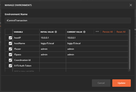 Problem this snippet solves: This is an example set for iControlREST which generates an Authentication Token and a Transaction session to add a new Data Group. This is only a single change but you can add many changes into the Transaction before VALIDATING and committing them. Steps taken: Get Auth Token - Request to generate a new Authentication Token and saves into the Environment variable X-F5-Auth-Token Extend Token Timeout - Increases the timeout value of the Auth Token, not always needed but good if you are running the command manually Get New Transaction - Request to generate a new Transaction session and saves into the Environment variable Coordination-Id POST new DG in Transaction - Creates a new Data Group Get Transaction Commands - Optional request to list all the commands and the order in the transaction Commit Transaction - Sends VALIDATING request to validate and commit the commends Get DG test - Optional to get the Data Group to confirm it has been created Find more information about iControlREST Transactions here https://devcentral.f5.com/s/articles/demystifying-icontrol-rest-part-7-understanding-transactions-21404 and in the user guides https://clouddocs.f5.com/api/icontrol-rest/ How to use this snippet: Download and install Postman https://www.getpostman.com/downloads/ Save the below JSON to a file and import as a new Postman Collection (see https://learning.getpostman.com/docs/postman/collections/intro_to_collections/ and https://learning.getpostman.com/docs/postman/collections/data_formats/#importing-postman-data). Finally setup a new Environment (https://learning.getpostman.com/docs/postman/environments_and_globals/manage_environments/) within Postman and ensure you have the following elements: hostIP - the Management IP of the F5 BIG-IP system hostName - the Hostname of the F5 BIG-IP system f5user - the username used to generate an Authentication Token f5pass - the password used to generate an Authentication Token X-F5-Auth-Token - leave blank will auto populate Coordination-Id - leave blank will auto populate e.g. Then you can run the Postman collection one request at a time or run via Postman's Collection Runner (https://learning.getpostman.com/docs/postman/collection_runs/using_environments_in_collection_runs). Code : { "info": { "_postman_id": "67195ea2-5ac0-4599-a650-5951b1bc1184", "name": "iControl Transaction Example", "schema": "https://schema.getpostman.com/json/collection/v2.1.0/collection.json" }, "item": [ { "name": "Get Auth Token", "event": [ { "listen": "test", "script": { "id": "6e3f6680-4199-4c4a-a210-272b4d2eef38", "exec": [ "tests[\"Status code is 200\"] = responseCode.code === 200;", "var jsonData = JSON.parse(responseBody);", "postman.setEnvironmentVariable(\"X-F5-Auth-Token\", jsonData.token.name);", "", "" ], "type": "text/javascript" } } ], "request": { "method": "POST", "header": [ { "key": "Host", "type": "text", "value": "{{hostName}}" }, { "key": "Content-Type", "value": "application/json" } ], "body": { "mode": "raw", "raw": "{\r\n\t\"username\":\"{{f5user}}\",\r\n\t\"password\":\"{{f5pass}}\",\r\n\t\"loginProviderName\": \"tmos\"\r\n}" }, "url": { "raw": "https://{{hostIP}}/mgmt/shared/authn/login", "protocol": "https", "host": [ "{{hostIP}}" ], "path": [ "mgmt", "shared", "authn", "login" ] } }, "response": [] }, { "name": "Extend Token Timeout Copy", "event": [ { "listen": "test", "script": { "id": "3bcdcdc6-fcad-46db-b9c0-4d7a8e8e1a69", "exec": [ "var jsonData = JSON.parse(responseBody);", "tests[\"Status code is 200\"] = responseCode.code === 200;", "tests[\"Token has been set\"] = jsonData.timeout == 36000;", "tests[\"Token is valid\"] = jsonData.userName === postman.getEnvironmentVariable(\"f5user\");", "" ], "type": "text/javascript" } } ], "request": { "method": "PATCH", "header": [ { "key": "Host", "value": "{{hostName}}", "type": "text" }, { "key": "Content-Type", "value": "application/json" }, { "key": "X-F5-Auth-Token", "value": "{{X-F5-Auth-Token}}" } ], "body": { "mode": "raw", "raw": "{\n\t\"timeout\":\"36000\"\n}" }, "url": { "raw": "https://{{hostIP}}/mgmt/shared/authz/tokens/{{X-F5-Auth-Token}}", "protocol": "https", "host": [ "{{hostIP}}" ], "path": [ "mgmt", "shared", "authz", "tokens", "{{X-F5-Auth-Token}}" ] } }, "response": [] }, { "name": "Get New Transaction", "event": [ { "listen": "test", "script": { "id": "cb847d93-2c3a-4990-8242-020d95532be6", "exec": [ "var jsonRsponse = JSON.parse(responseBody)", "pm.environment.set(\"Coordination-Id\", jsonRsponse.transId);", "", "" ], "type": "text/javascript" } } ], "request": { "auth": { "type": "noauth" }, "method": "POST", "header": [ { "key": "Host", "value": "{{hostName}}", "type": "text" }, { "key": "content-type", "value": "application/json", "type": "text" }, { "key": "X-F5-Auth-Token", "value": "{{X-F5-Auth-Token}}", "type": "text" } ], "body": { "mode": "raw", "raw": "{}" }, "url": { "raw": "https://{{hostIP}}/mgmt/tm/transaction/", "protocol": "https", "host": [ "{{hostIP}}" ], "path": [ "mgmt", "tm", "transaction", "" ] } }, "response": [] }, { "name": "POST new DG in Transaction", "request": { "auth": { "type": "noauth" }, "method": "POST", "header": [ { "key": "Host", "value": "{{hostName}}", "type": "text" }, { "key": "content-type", "value": "application/json", "type": "text" }, { "key": "X-F5-Auth-Token", "value": "{{X-F5-Auth-Token}}", "type": "text" }, { "key": "X-F5-REST-Coordination-Id", "value": "{{Coordination-Id}}", "type": "text" } ], "body": { "mode": "raw", "raw": "{\n \"partition\": \"Common\",\n \"name\": \"url_filter_dg\",\n \"records\": [\n {\n \"name\": \"/data\",\n \"data\": \"Allow\"\n },\n {\n \"name\": \"/filter\",\n \"data\": \"Block\"\n },\n {\n \"name\": \"/hello\",\n \"data\": \"Black\"\n },\n {\n \"name\": \"/login\",\n \"data\": \"Allow\"\n }\n ],\n \"type\":\"string\"\n}" }, "url": { "raw": "https://{{hostIP}}/mgmt/tm/ltm/data-group/internal", "protocol": "https", "host": [ "{{hostIP}}" ], "path": [ "mgmt", "tm", "ltm", "data-g