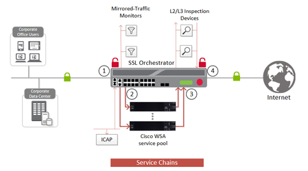 Data transiting between clients (e.g., PCs, tablets, phones, etc.) and servers are predominantly encrypted with Secure Socket Layer (SSL) or the newer Transport Layer Security (TLS) (For reference, see the 2019 TLS Telemetry Report Summary from F5 Labs) Pervasive encryption results in threats being hidden and invisible to security inspection unless traffic is decrypted. The decryption and encryption of data by different devices that are performing security functions, such as Cisco Web Security Appliance (WSA), potentially increases overhead and latency. Added to the visibility difficulties and the fragmented nature of the security stack, enterprises are finding it challenging to design a comprehensive and lasting security strategy. F5® SSL Orchestrator™ and Cisco WSA integrate to deliver centralized visibility, orchestration, security, and control of web traffic, optimizing protection from web-based threats against any device. Bill of Materials F5 SSL Orchestrator Optional functional add-ons include URL filtering subscription, IP Intelligence subscription, network hardware security module (HSM), and F5 Access Manager (APM). Cisco Web Security Appliance Pre-requisites F5 SSL Orchestrator is licensed and set up with internal and external VLANs and self-IP addresses. An SSL certificate—preferably a subordinate certificate authority (CA)—and private key are imported into SSL Orchestrator. The CA certificate chain with the root certificate is imported into the client browser. SSL orchestration generally presents a new paradigm in the typical network architecture. Integrated with SSL Orchestrator, the traffic to the Cisco WSA is decrypted – including usernames, passwords, social security, and credit card numbers, etc. It is therefore highly recommended that security services be isolated within a private, protected enclave defined by the SSL Orchestrator. Solution Deployment In this example deployment setup, the SSL Orchestrator is configured to send decrypted traffic to an inline Cisco WSA. SSL Orchestrator handles both decryption and re-encryption of HTTPS traffic, with an inspection zone installed between the ingress and egress. Decrypted traffic is steered to a service pool of Cisco WSA devices. You can also deploy the F5 system as a device sync/failover device group (including an HA pair) with a floating IP address for high availability. How traffic flows in this deployment: Client traffic arrives at the ingress side of the SSL Orchestrator, where it is classified, and interesting HTTPS traffic is decrypted as part of the SSL handling process. SSL Orchestrator steers the decrypted traffic through the load balanced Cisco WSA service pool as part of a service chain that potentially includes multiple types of security services. The HTTP traffic is inspected by the Cisco WSA services for any hidden threats before sending that traffic back to the SSL Orchestrator. The SSL Orchestrator orchestrates the decrypted traffic through other services in the chain before it aggregates and re-encrypts the traffic, which is then routed to the next destination. Configure the Web Proxy Service Please refer to the appropriate Cisco WSA documentation for more detailed information on configuring WSA. The following are the minimal settings required for integration with SSL Orchestrator. Configuration of the web proxy will be performed from the WSA UI. The Cisco WSA can be configured as either a transparent or explicit web proxy. Deploy SSL Orchestrator using Guided Configuration The SSL Orchestrator guided configuration presents a completely new and streamlined user experience. This workflow-based architecture provides guided configuration steps tailored to a selected topology. Step 1: Topology Properties SSL Orchestrator creates discreet configurations based on the selected topology. Select L3 Outbound (transparent proxy) or L3 Explicit Proxy to support decrypted forward proxy traffic flows through the Cisco WSA. Step 2: SSL Configuration Select the previously imported subordinate CA certificate (see Prerequisites, above) for signing and issuing certificates to the end-host for client-requested HTTPS websites that are intercepted by SSL Orchestrator. Step 3: Create the Cisco WSA Service The services list section defines the security services that interact with SSL Orchestrator. The guided configuration includes a services catalog that contains common product integrations. In the service catalog, double click the 'Cisco WSA HTTP Proxy' service and configure the service settings: Cisco WSA IP address, port, and connected VLANs. Create these routes to route from the Cisco WSA appliance back to SSL Orchestrator. A gateway route to SSL Orchestrator 'from-service' self-IP ( 198.19.96.245 in the above example). A static return route to define the path back to the SSL Orchestrator 'to-service' self-IP (198.19.96.7 in the above example) on the inbound side of the Cisco WSA. Using the SSL Orchestrator service catalog, create additional security services as required before proceeding to the next step. Step 4: Service Chains Create a service chain, which is an ordered list of security devices. The service chain determines which services receive decrypted traffic. Step 5: Security Policy SSL Orchestrator’s guided configuration presents an intuitive rule-based, drag-and-drop user interface for the definition of security policies. In the background, SSL Orchestrator maintains these security policies as visual per-request policies. If traffic processing is required that exceeds the capabilities of the rule-based user interface; the underlying per-request policy can be managed directly. Use this section to create custom rules as required. Step 6: Intercept Rule Interception rules are based on the selected topology and define the listeners (analogous to BIG-IP Local Traffic Manager virtual servers) that accept and process different types of traffic, such as TCP, UDP, or other. The resulting listeners will bind the SSL